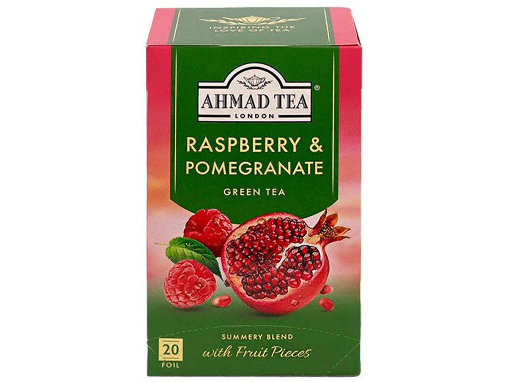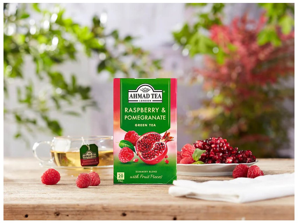Ahmad Tea Raspberry & Pomegranate je okouzlující zelený čaj, ve kterém se jemná travnatá chuť čínského čaje snoubí se sladkostí malin a svěžestí granátového jablka.