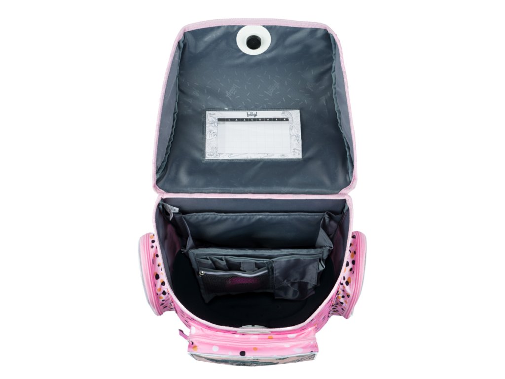 • Uvnitř aktovky je průhledná kapsa na rozvrh a vnitřní organizér umožňující rovnoměrné rozložení hmotnosti.