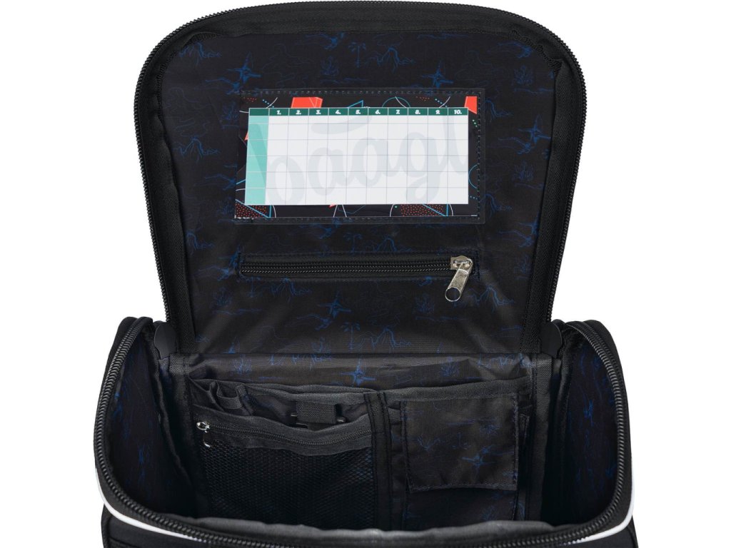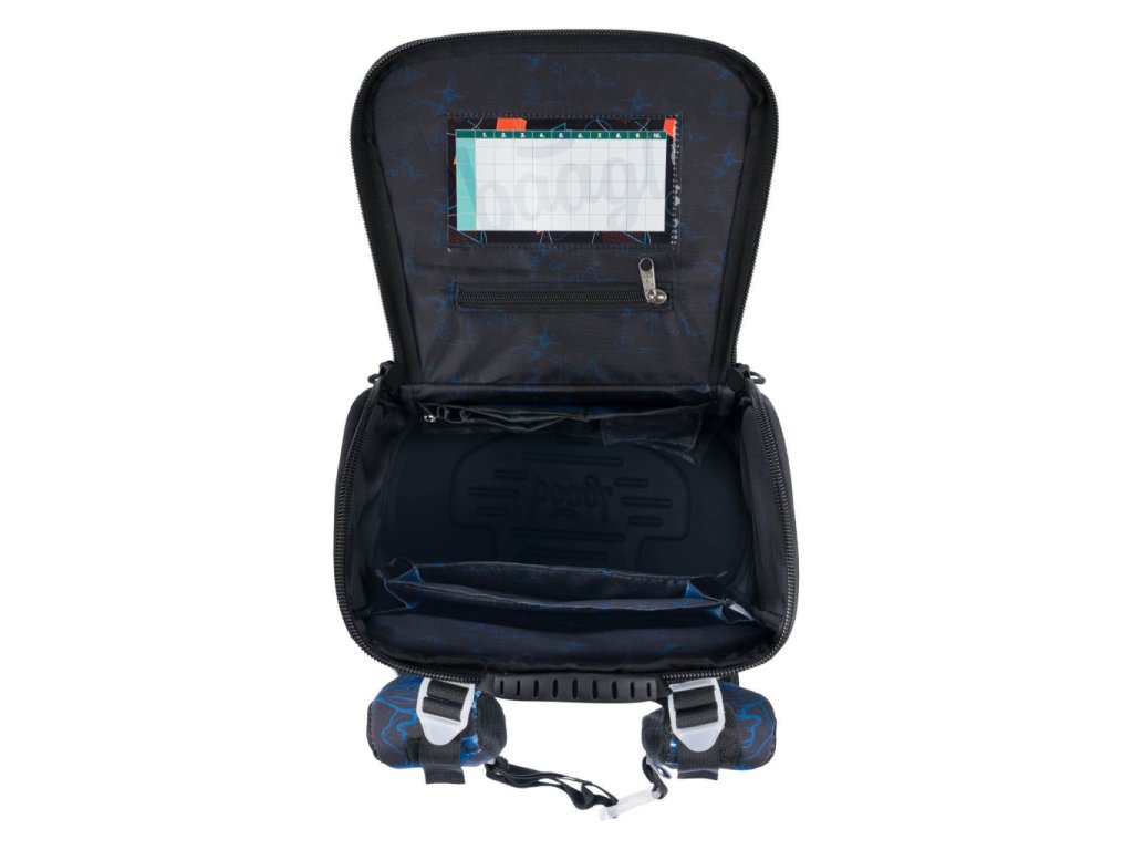 • uvnitř aktovky je průhledná kapsa s rozvrhem a vnitřní organizér umožňující rovnoměrné rozložení hmotnosti, doplněný gumičkou pro fixaci