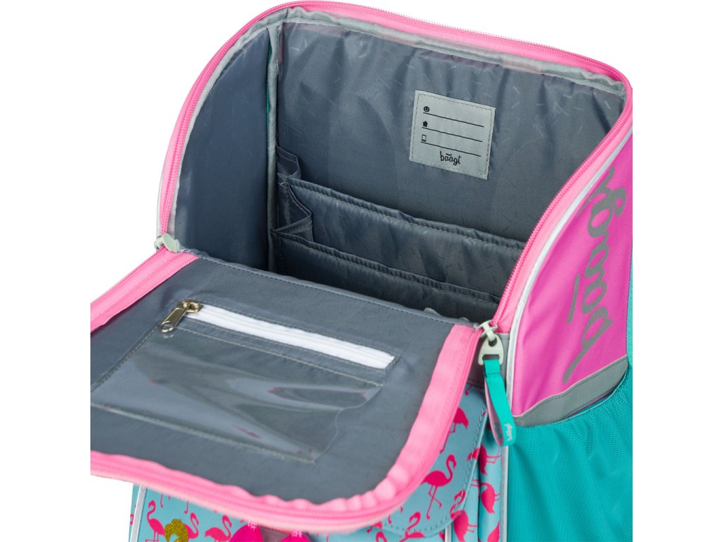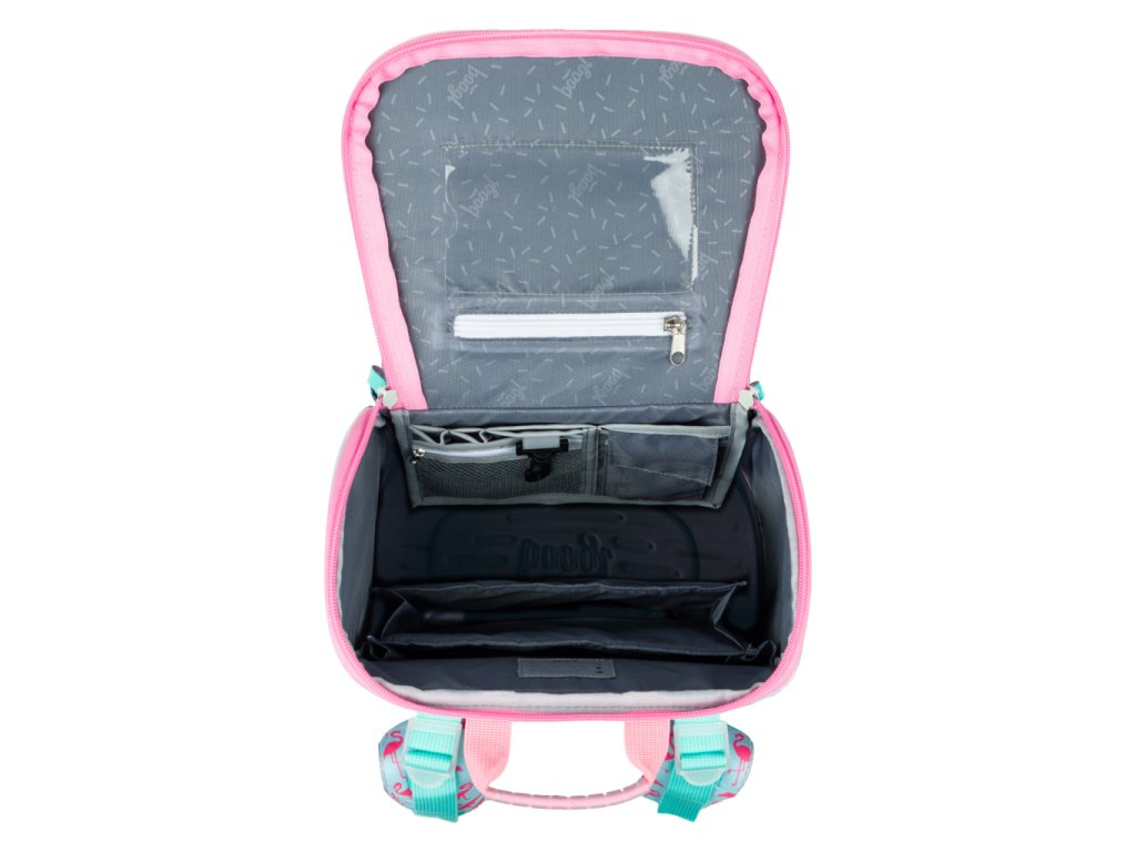 • Uvnitř aktovky je průhledná kapsa na rozvrh a vnitřní organizér umožňující rovnoměrné rozložení hmotnosti, doplněný gumičkou pro fixaci.