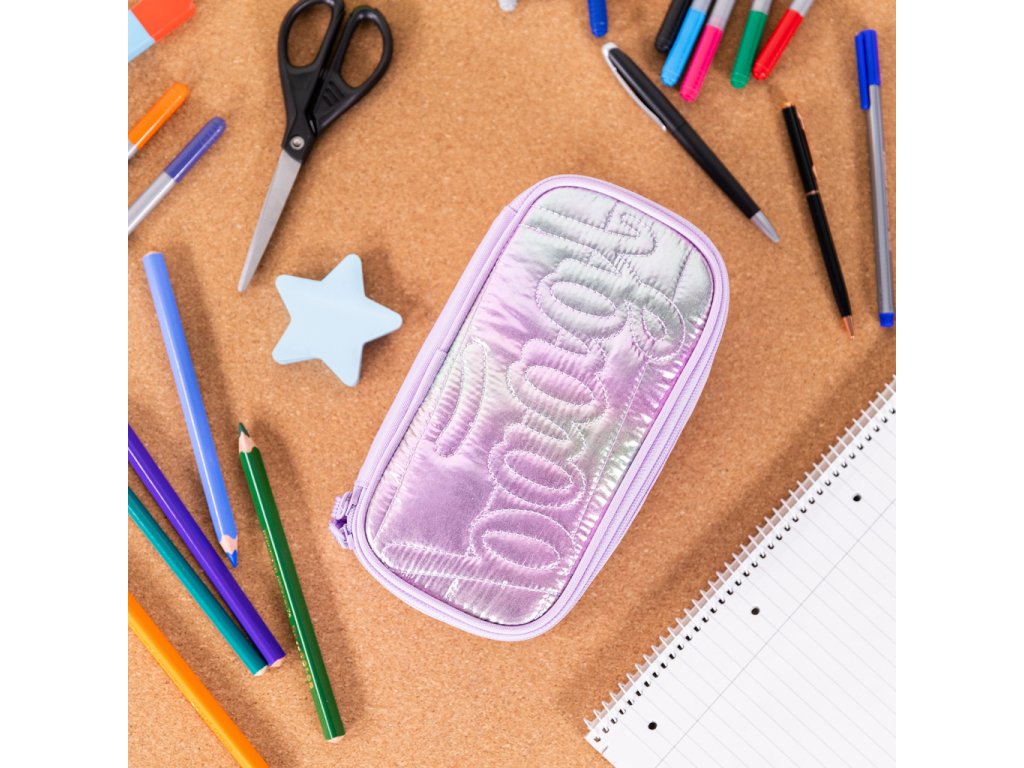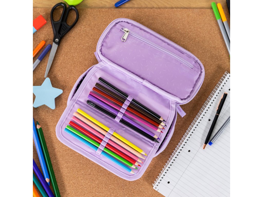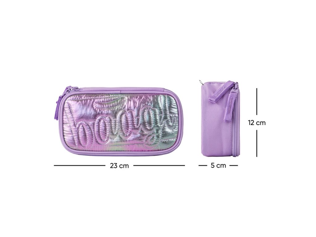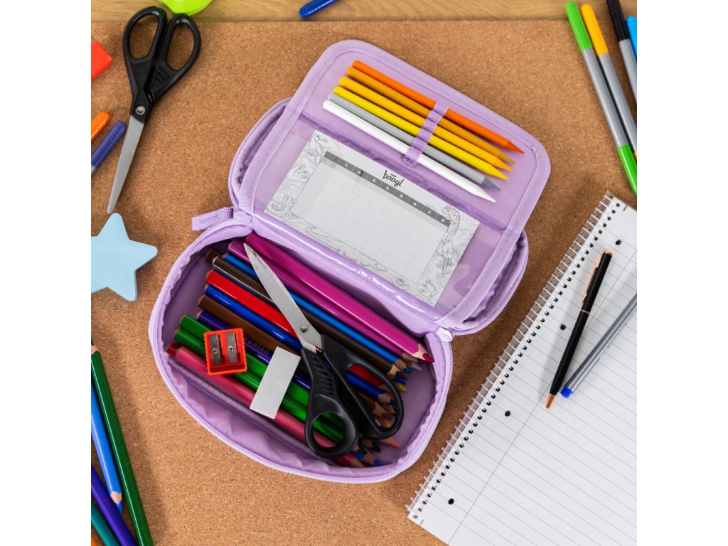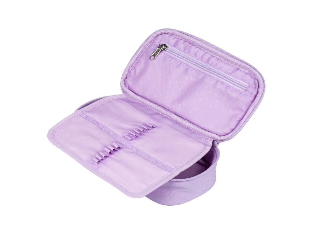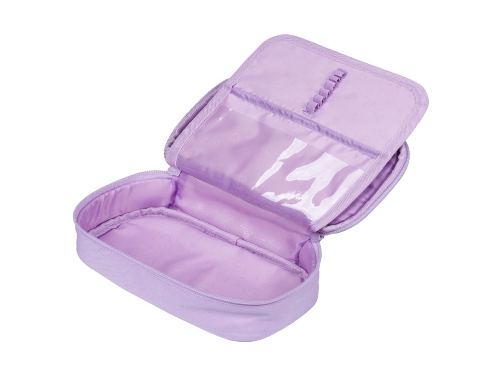 • Kompaktní penál na zip s prostornou hlavní komorou a dvojitou výklopnou chlopní nabízí dostatek prostoru pro psací potřeby i drobnosti.• Součástí penálu je také vnitřní kapsa a okénko na rozvrh hodin.