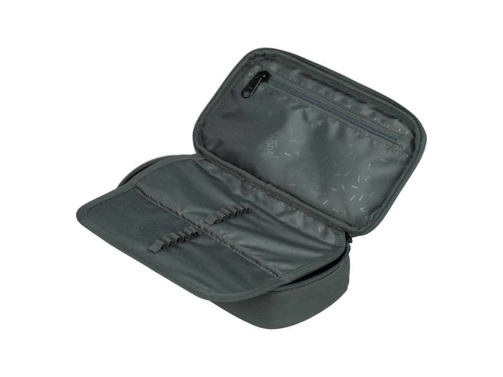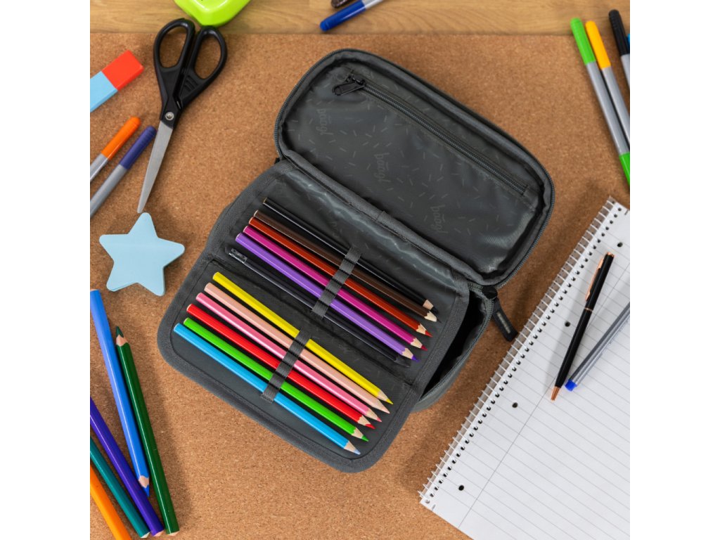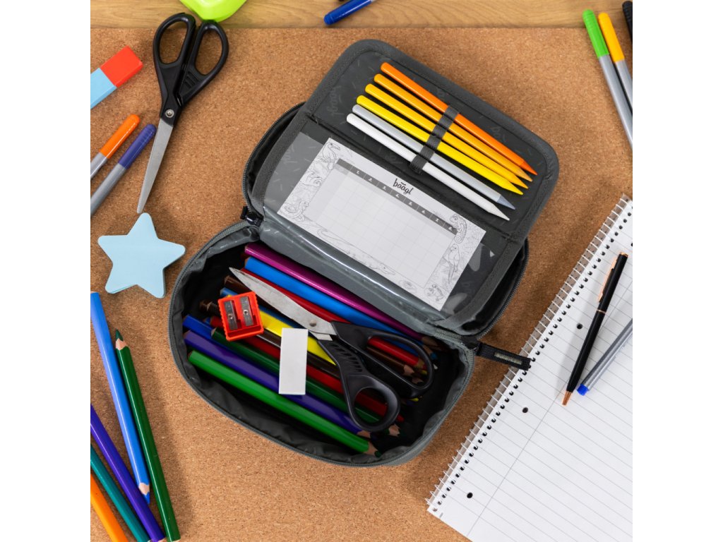 • Kompaktní penál na zip s prostornou hlavní komorou a dvojitou výklopnou chlopní nabízí dostatek prostoru pro psací potřeby i drobnosti.• Součástí penálu je také vnitřní kapsa a okénko na rozvrh hodin.