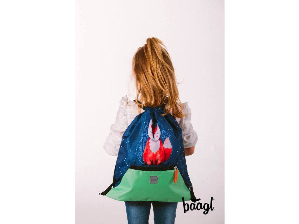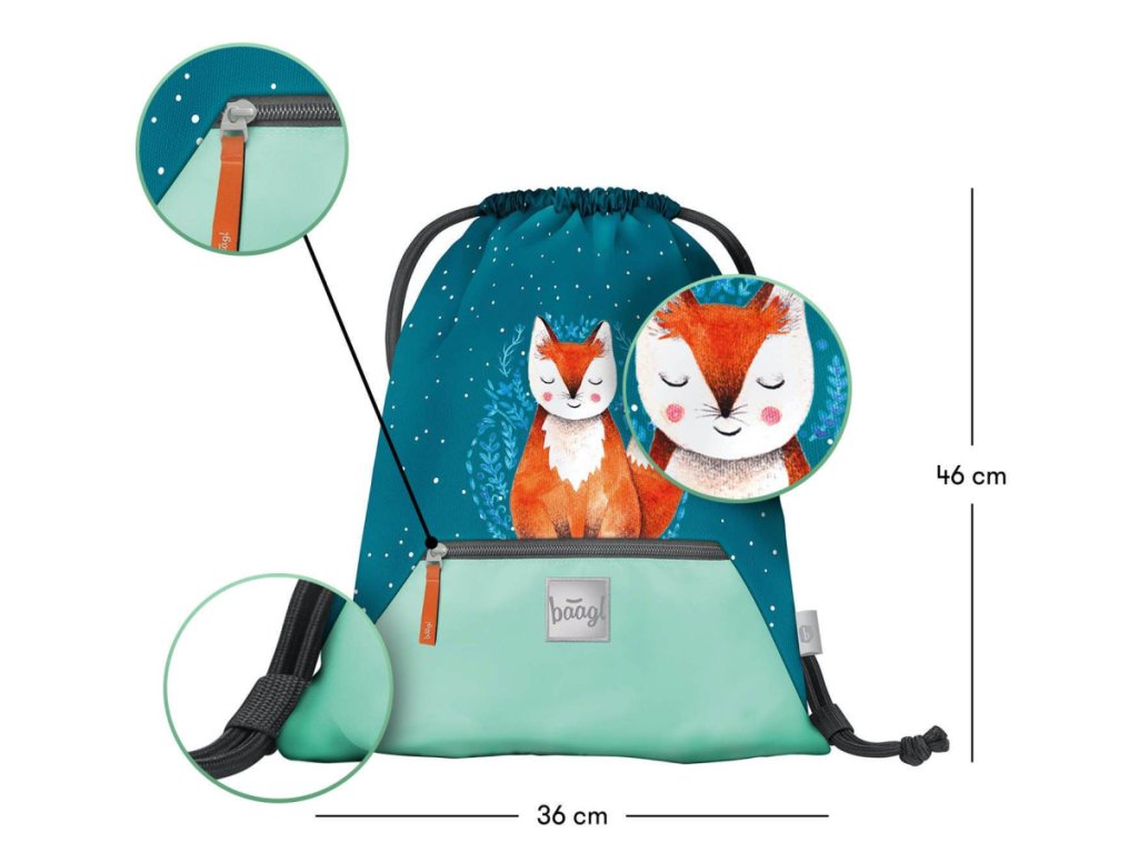 Sáček na záda s motivem lišky se bude líbit každé dívce, která má ráda zvířata. Vak se hodí na přezůvky, cvičky, potřeby na tělocvik nebo jen tak na drobnosti. Je vyroben z omyvatelného materiálu, v dolní části praktická kapsa na zip. Zdrhování pomocí tkanic.