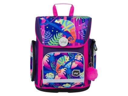 Fialová holčičí aktovka s obrázkem chameleona, vhodná pro 1. - 2. třídu základní školy.