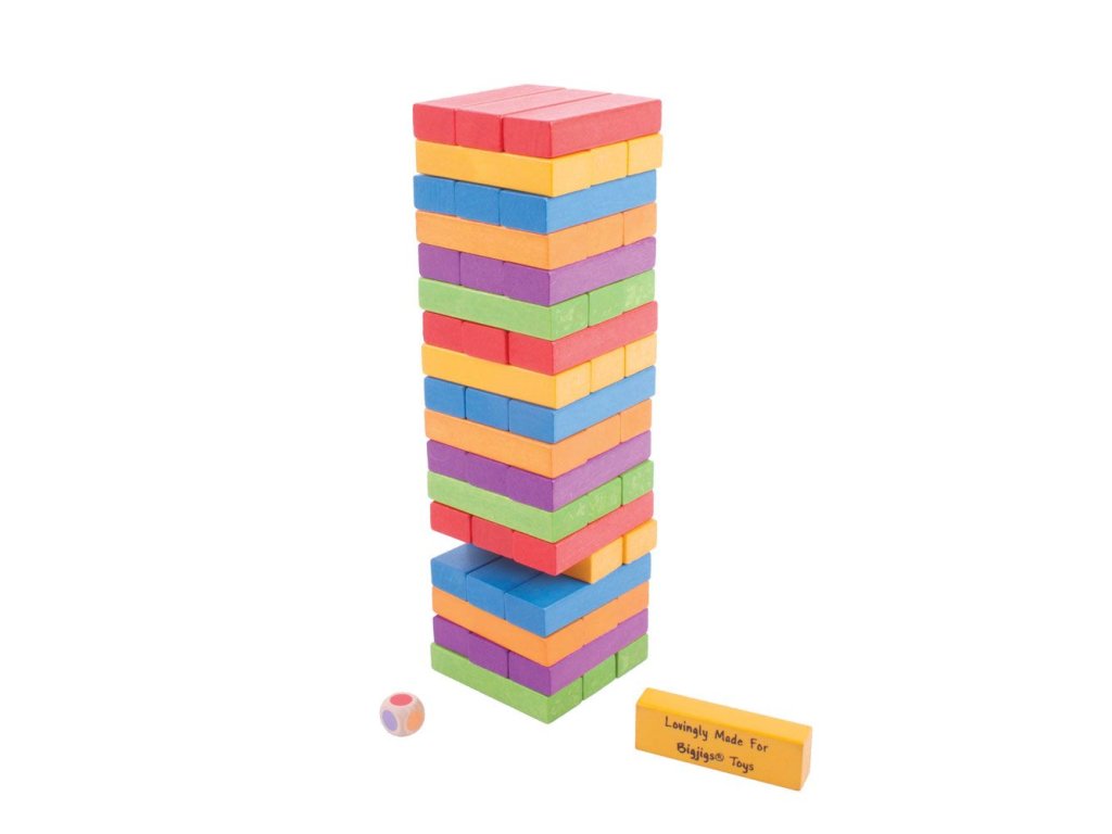 Pestrobarevné dílky dělají tuto hru speciální. Ke hře budete potřebovat soustředěnost a zručnost. Hraje se takto – hodíte kostkou a podle toho jaká barva padne musíte vytáhnout stejně barevný dílek z věže, ale bez toho, aby celá spadla! Pokud vás hra omrzí, můžete si z dílků stavět dle fantazie. Tak kdo prokáže nejjistější ruku a vyhraje? Hra pro mladé i staré, trénuje trpělivost a jemnou motoriku. Hlavní vlastnosti: pestrobarevné dílky pro všechny věkové kategorie trénuje trpělivost a jemnou motorikuDoplňkové parametry