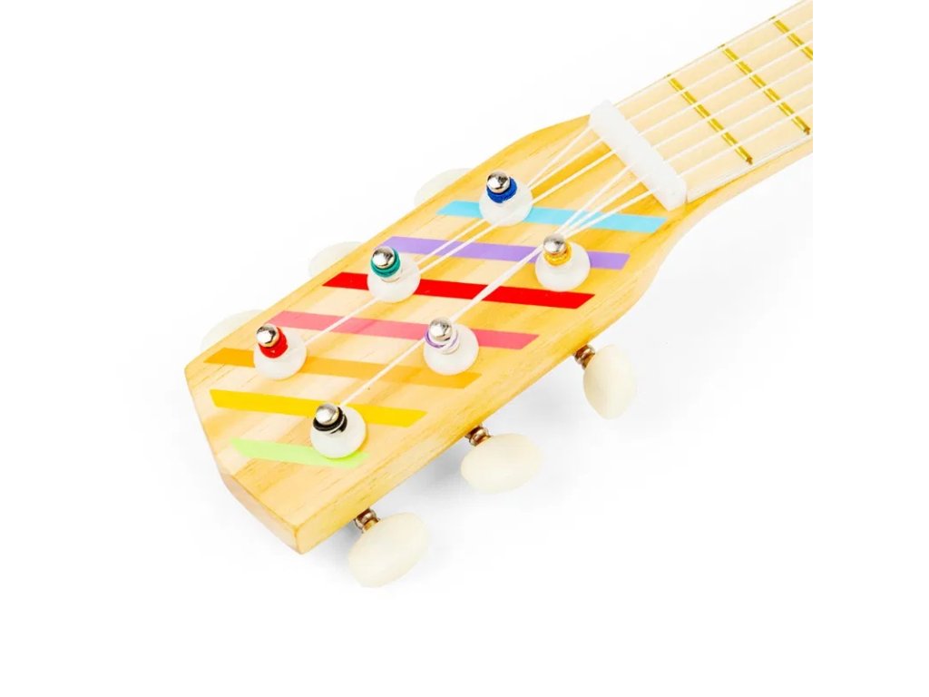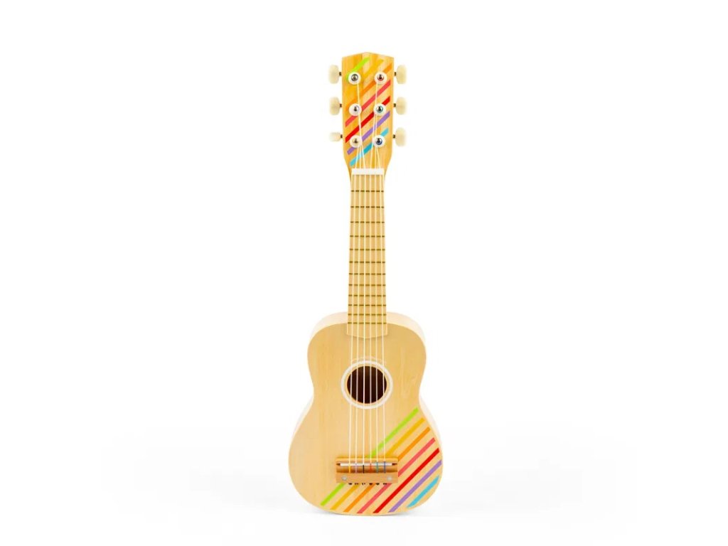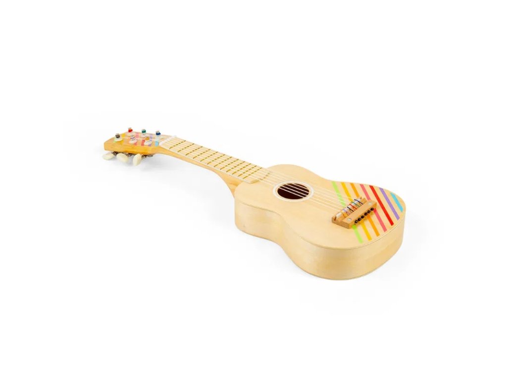 Ideální první nástroj pro začínající hudebníky. Dřevěná dětská kytara s šesti strunami z nylonu může být naladěna jako ta pravá. V balení také trsátko na vybrnkávání. Je vyrobena z vysoce kvalitního dřeva s certifikací FSC. Děti si užijí zábavu, když budou předvádět koncert své oblíbené rockové nebo popové hvězdy. Bude to show pro celou rodinu! Krásná dřevěná kytara s pruhovaným designem je vyrobena tak akorát pro dětské ruce. Děti se díky ní naučí rytmu a časování. Podporuje senzorickou a kreativní hru. Splňuje všechny aktuální evropské bezpečnostní normy. Nejedná se o hudební nástroj, ale pouze o hračku. Hlavní vlastnosti: 6 nylonových strun, které lze naladitobsahuje trsátkovhodné pro začínající hudebníkyučí rytmické dovednosti od raného věkupruhovaný designvyrobeno z FSC® dřeva Značka a certifikát FSC® (Forest Stewardship Council) zaručuje, že dřevo, ze kterého byl produkt vyroben, nebylo vytěženo nelegálně a pochází z lesů obhospodařovaných šetrným či přírodě blízkým způsobem, ve kterém jsou dodržovány přísné environmentální a sociální požadavky. Značka FSC® na výrobku znamená, že svým nákupem pomáháte chránit lesy a podporujete šetrné, odpovědné či přírodě blízké hospodaření, díky kterému jsou naše lesy stabilnější, zdravější, mají přirozenou druhovou skladbu a lépe odolávají negativním následkům klimatických změn.Doplňkové parametry