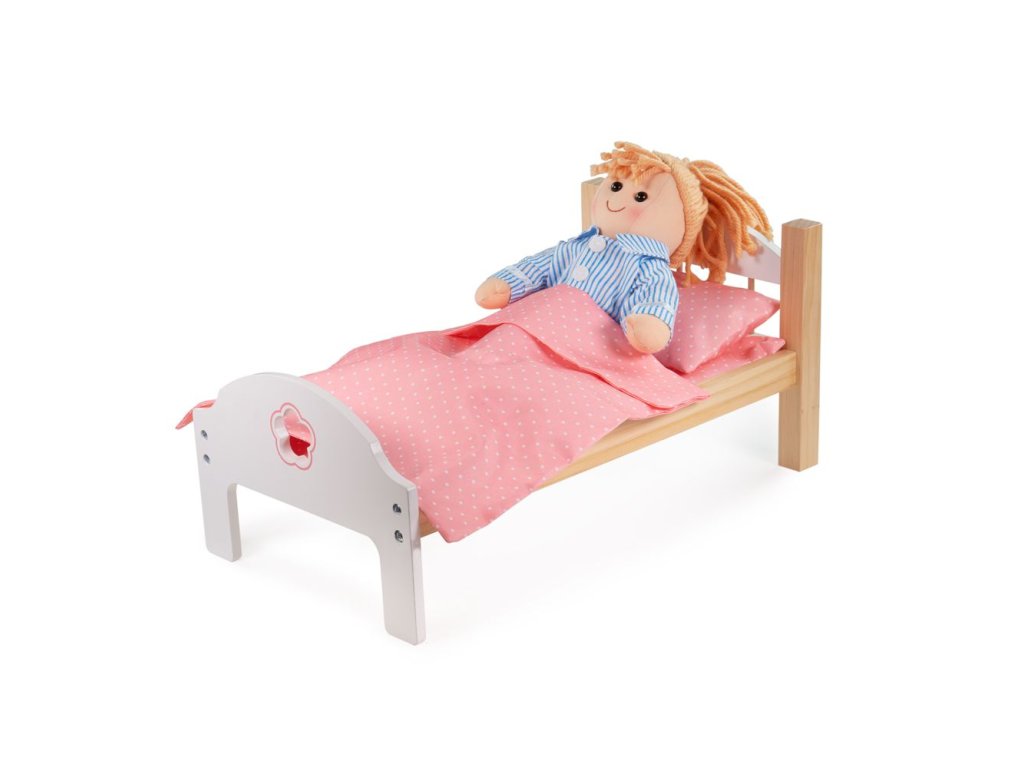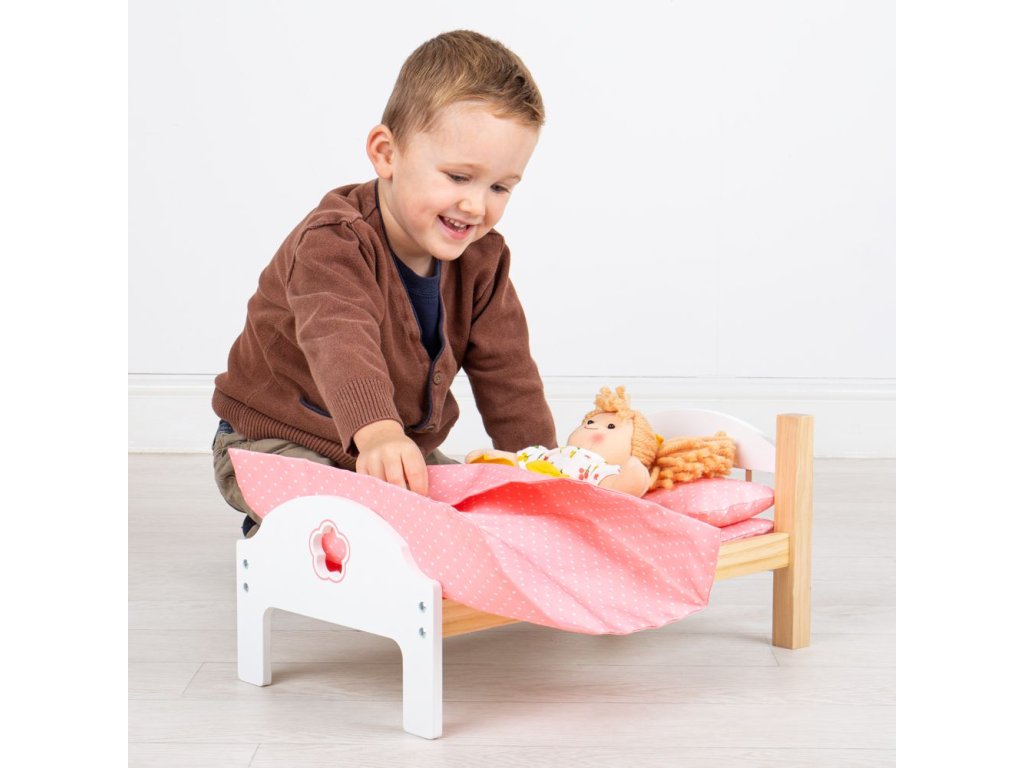 Naučte svou ratolest pečovat o panenku. Nechte dítko uložit svou panenku k spánku. Tato dřevěná postýlka je kompatibilní s Bigjigs Toys látkovými panenkami. Tato hezká postýlka pro panenky je dodávána s růžovými puntíkovanými peřinkami, které udrží nejlepšího kamaráda vašeho nejmenšího před spaním v teple. Spodní čelo postele má také vyříznutou květinu. Tato hračka rozvíjí v dětech skutečný smysl pro zodpovědnost. Hlavní vlastnosti: kompatibilní s většinou panenekpodporuje kreativiturozvíjí smysl pro zodpovědnostvčetně peřinekDoplňkové parametry