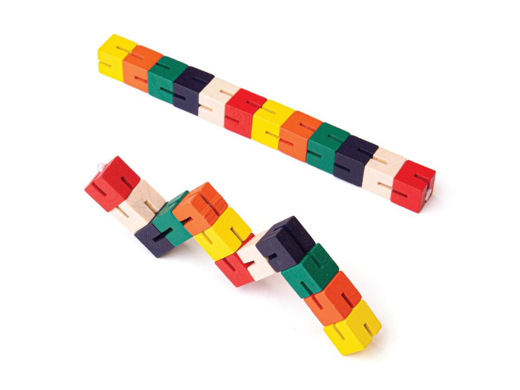 Had, pes, mořský koník… Tvary, které můžete tvořit s těmito barevnými hady, nemají konce! Otáčejte články a převracejte je – manipulace s nimi pomáhá rozvíjet jemnou motoriku a zručnost. Hračka se snadno vejde do kapsy, může tak dětem pomoci zpestřit dlouhou cestu, nebo i rodičům ulevit od stresu. Články jsou vyrobeny ze dřeva a spojeny odolnou gumou. Hlavní vlastnosti:snadná manipulacekapesní velikostDoplňkové parametry