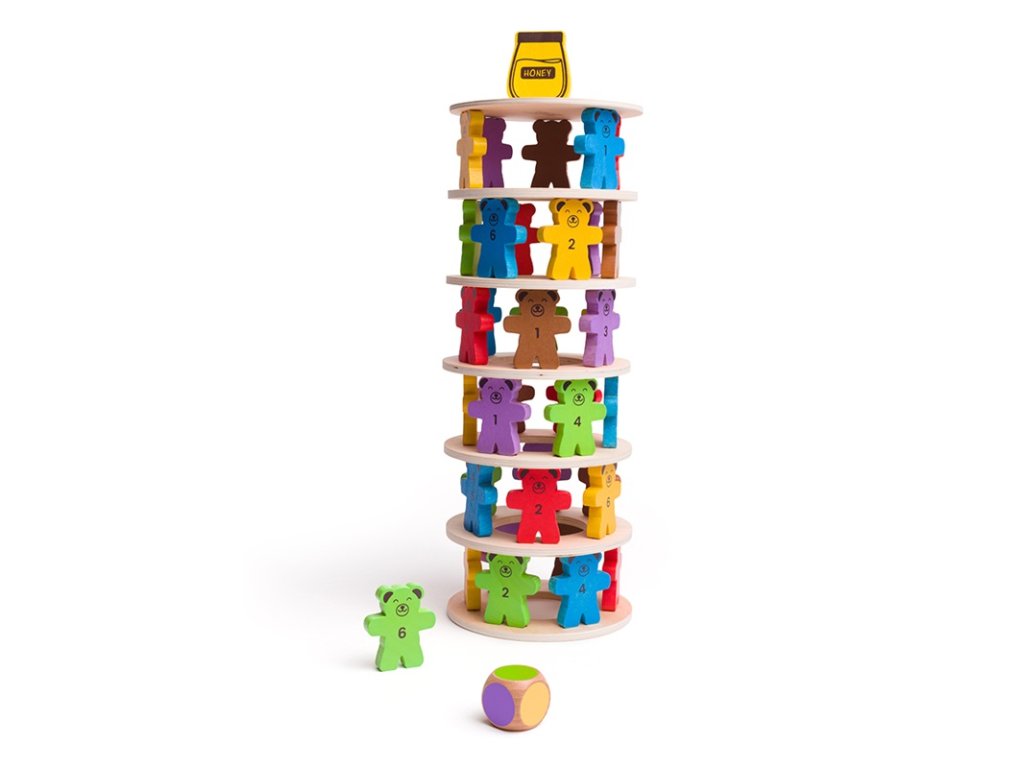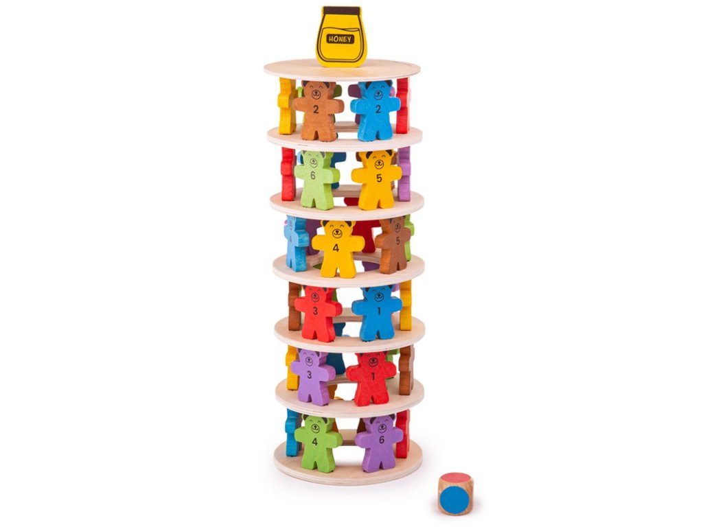 Kdo shodí sklenici medu jako první? Postavte za pomoci medvídků věž. Hoďte si kostkou, která určí barvu medvěda, na první dřevěný kruh postavte 6 medvědů a poté na ně položte další dřevěný kruh. Tento postup opakujte. Ale pozor, ať vám medvědí věž nespadne! Vyrobeno z kvalitních materiálů ze zodpovědných zdrojů. Splňuje evropské bezpečnostní standardy. Vhodné od 3 let. Hlavní vlastnosti: 6 mezikruží a víko, 36 figur medvědů, figura džbánu a kostkarobustní a odolné provedenívyrobeno s ohledy na udržitelnostDoplňkové parametry