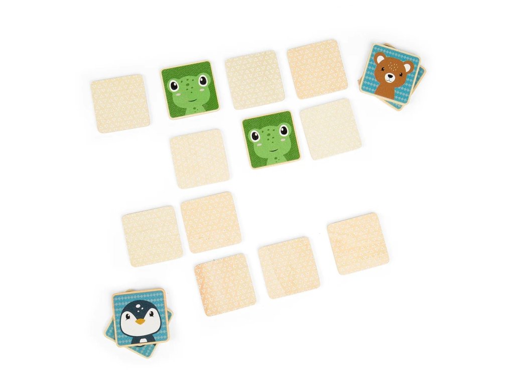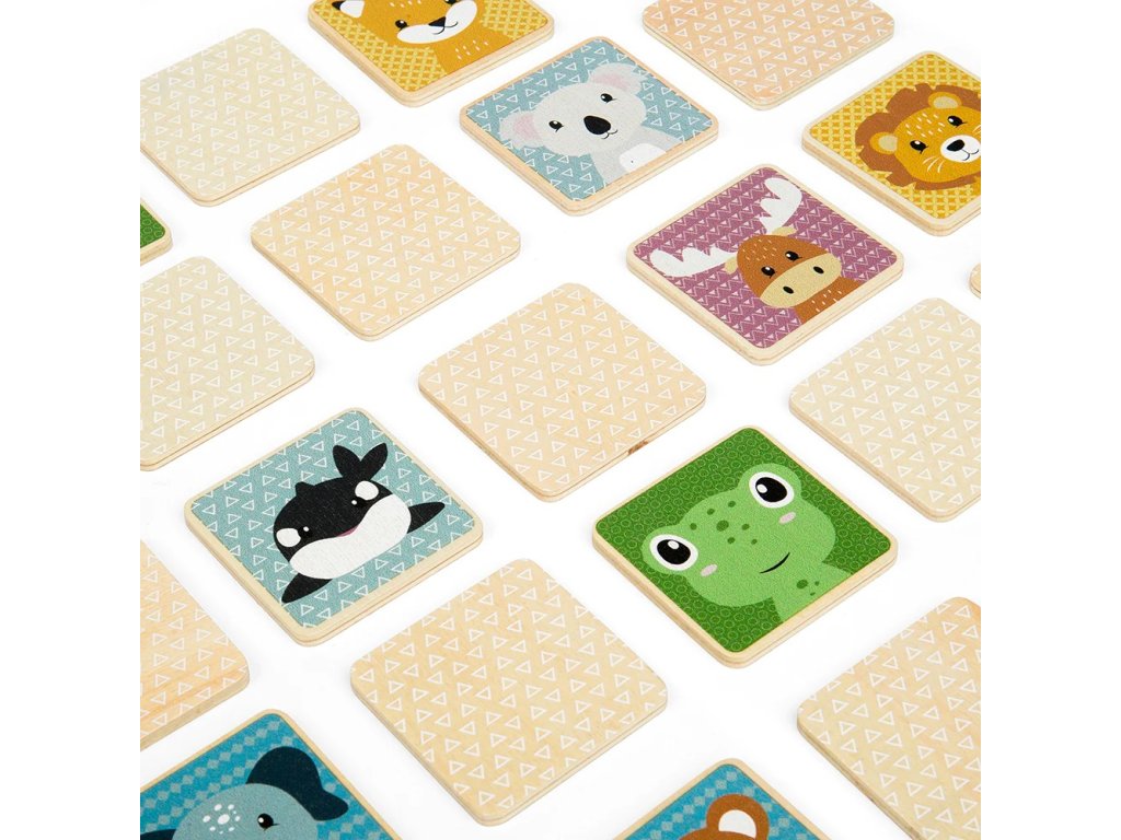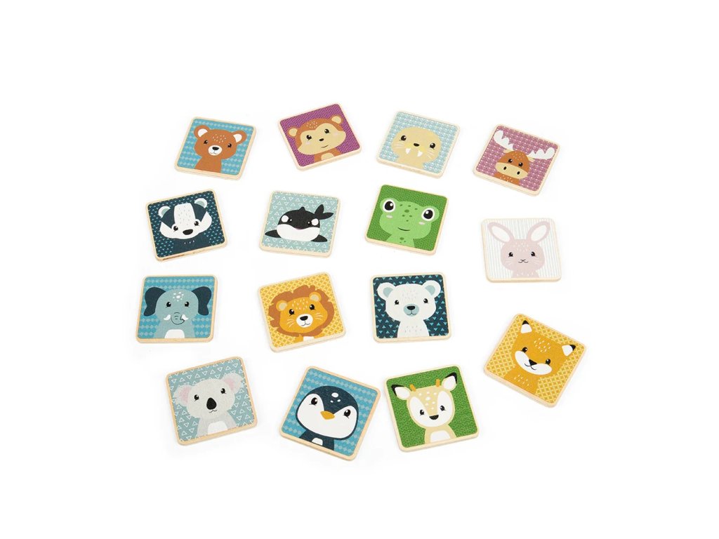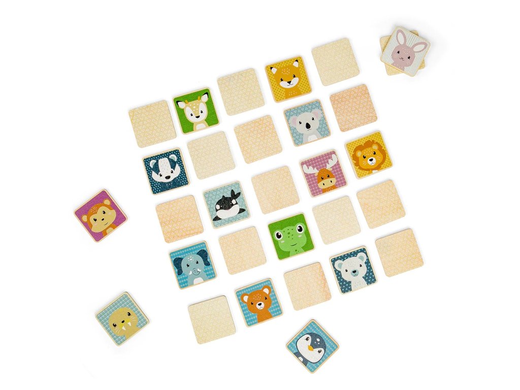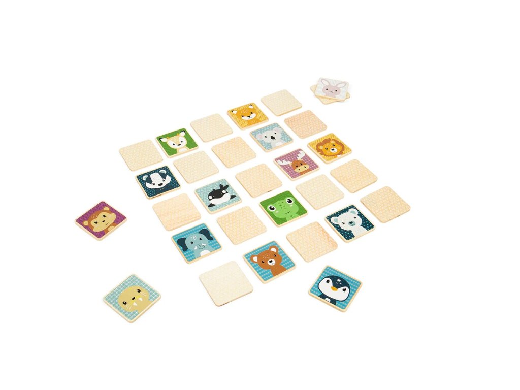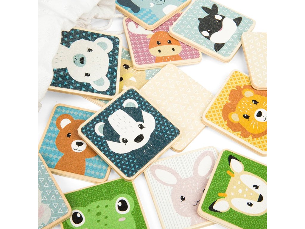 Zvířecí pexeso pro malé tlapky. V balení najdete 30 dřevěných dílků s krásnými ilustracemi koaly, lva, slona, opice… Všechny dílky zamíchejte a poté je rozložte lícem dolů na hrací plochu. Hráči se na řadě střídají, vždy otočí dva dílky. Pokud se dílky shodují, vezmou si je a odloží stranou. Pokud se dílky neshodují, otočí je zpět a na řadě je druhý hráč. Vítězí hráč, který má na konci nejvíce dílků. Dřevěné pexeso je zabaleno v bavlněném pytlíku se šňůrkou. Hra dětem pomůže s rozvojem zručnosti, paměti a kognitivních dovedností.