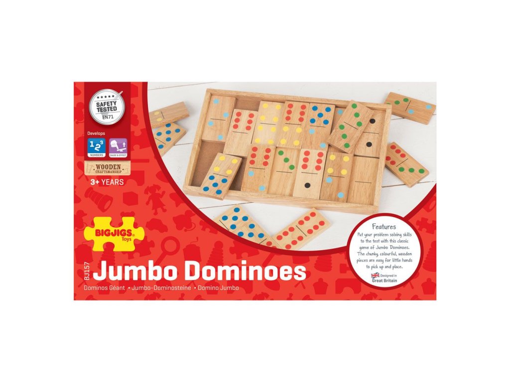 Tohle pestrobarevné dřevěné domino Jumbo, je perfektně dimenzováno pro malé ručičky, kterým se tak dílky snadno zvedají a umisťují. Hra pomáhá rozvíjet obratnost, dovednosti v souhře a koncentraci. Hrací dílky lze po ukončení hry uložit do dřevěné krabice s posuvným víkem. Hlavní vlastnosti: vyrobeno z vysoce kvalitních materiálůvyhovuje současným evropským bezpečnostním normámobsahuje 28 hracích dílkůDoplňkové parametry
