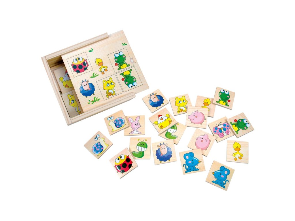 Díky pestrobarevným obrázkům roztomilých zvířátek se hraje téměř samo. Pexeso je baleno v praktické krabičce s výsuvným víkem – vše vyrobeno z lehké, ale pevné překližky.