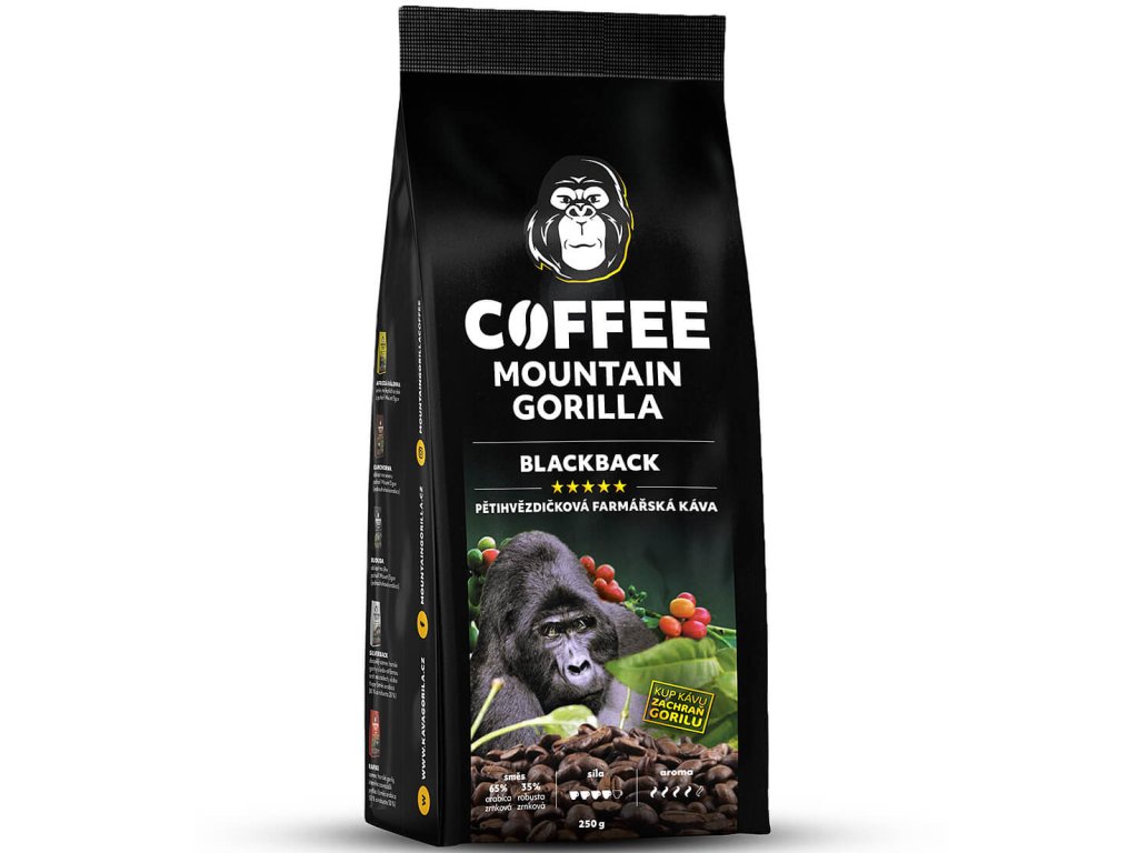 Blackback je exklusivní směs arabiky ze sopky Mount Elgon a robusty z nížinné oblasti Kibaale. Hořká zemitá robusta vytváří pevné tělo směsi Blackback. Ovocný nádech citrusových plodů jí dodává směs našich arabik Africká královna. Kávu jsme pojmenovali po mladším gorilím samci – blackbackovy pro jeho energii.