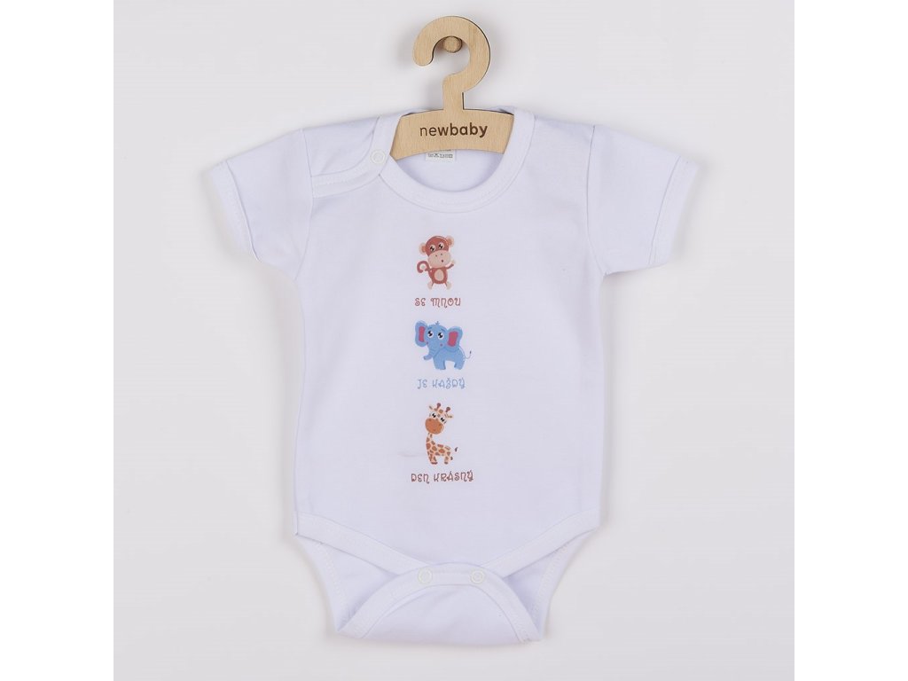 Originální bavlněné kojenecké body s krátkým rukávem New Baby s nápisem Se Mnou Je Každý Den Krásný a obrázkem. Barvy použité k potisku jsou certifikované a vhodné pro miminka. Je vyrobeno z příjemného a kvalitního materiálu, ve kterém se bude Vaše miminko cítit příjemně. Body má zapínáni na cvočky na ramínku a mezi nožičkami, což usnadňuje oblékání a přebalování. Dopřejte Vašemu miminku vyniknout v originálním body.
