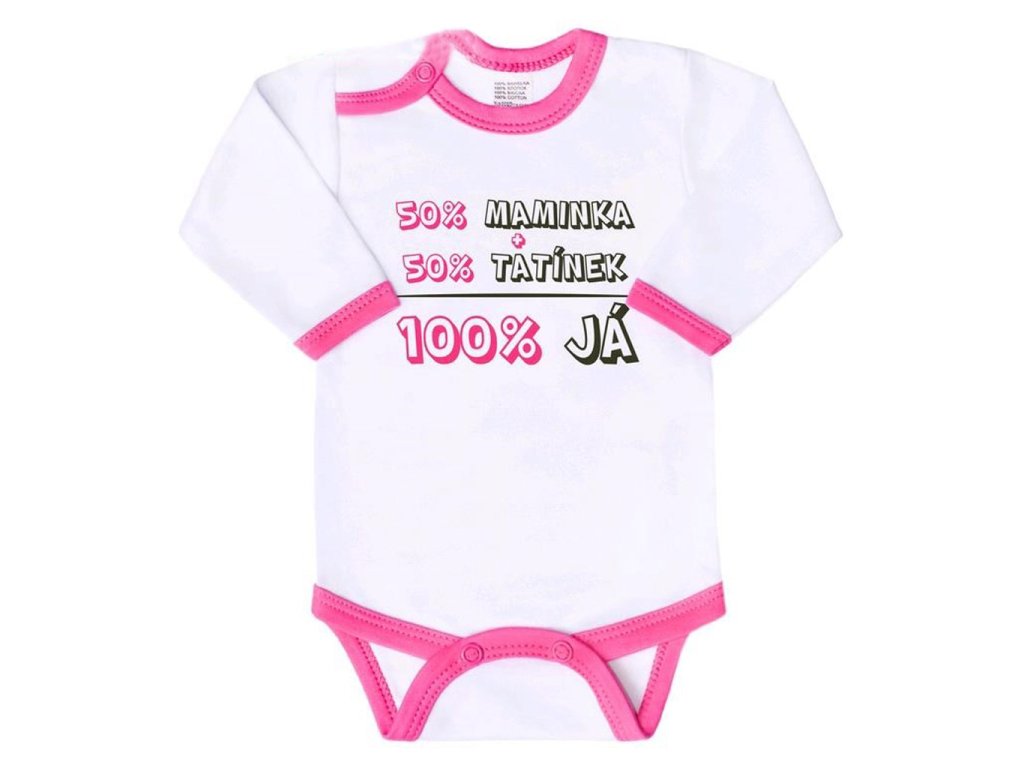 Originální bavlněné kojenecké body s dlouhým rukávem New Baby, s vtipným nápisem 50% MAMINKA + 50% TATÍNEK - 100% JÁ. Barvy použité k potisku jsou certifikované a vhodné pro miminka. Je vyrobeno z příjemného a kvalitního materiálu, ve kterém se bude Vaše miminko cítit příjemně. Body má zapínáni na cvočky na ramínku a mezi nožičkami, což usnadňuje oblékání a přebalování. Dopřejte Vašemu miminku vyniknout v originálním body.