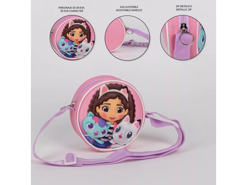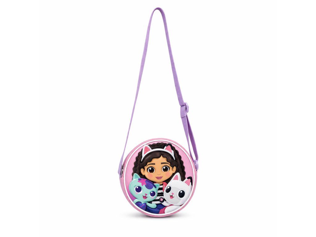 Roztomilá dětská kabelka přes rameno s oblíbeným motivem Gabby’s Dollhouse je skvělým doplňkem pro malé slečny. Kulatý tvar a hravý design s postavičkami z pohádky zaujmou na první pohled a dodají outfitu veselý styl.