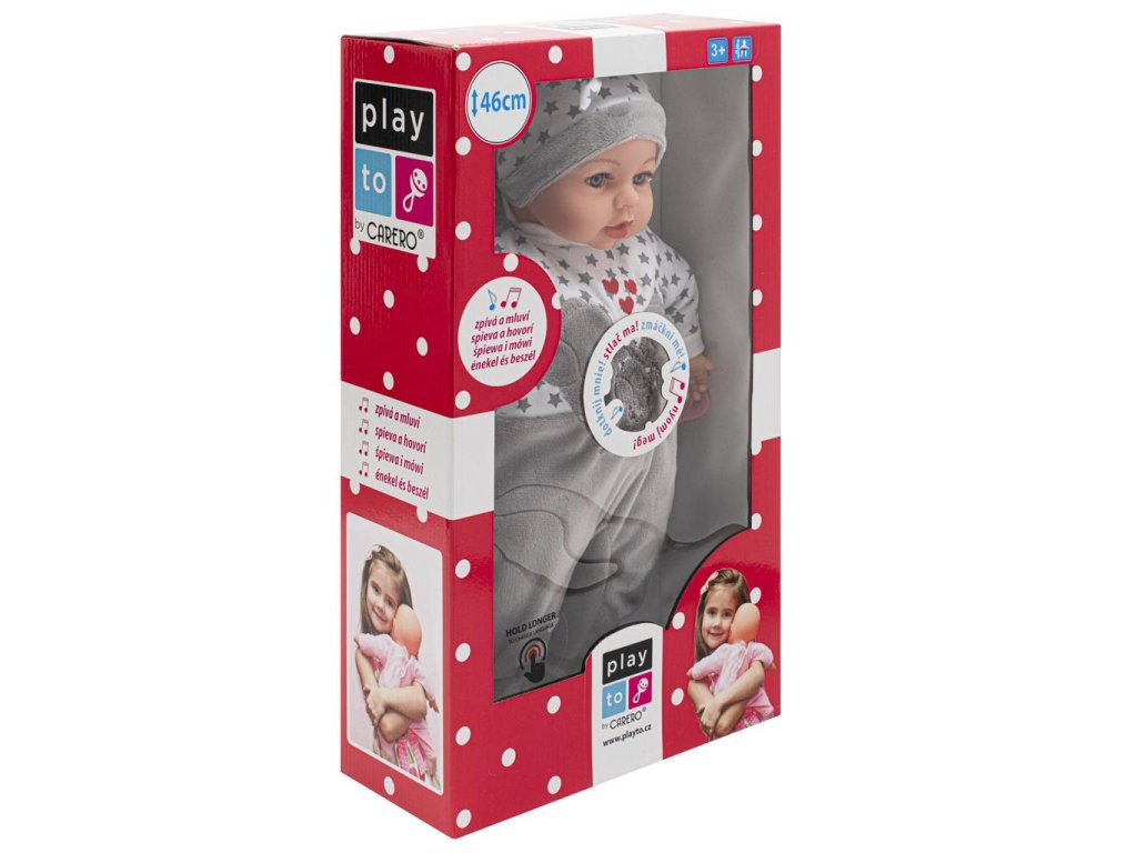 Krásná dětská panenka Lola od PlayTo, která udělá radost každé holčičce Tělo panenky je vyrobeno z měkkého materiálu. Ruce, nohy a hlava jsou z gumy. Panenka je oblečena do oblečení, které lze snadno svléknout a vyprat.Panenka má dudlík. Panenka je dlouhá 46 cm. Panenka má modul, který mluví 4 jazyky: polsky, česky, slovensky a maďarsky.