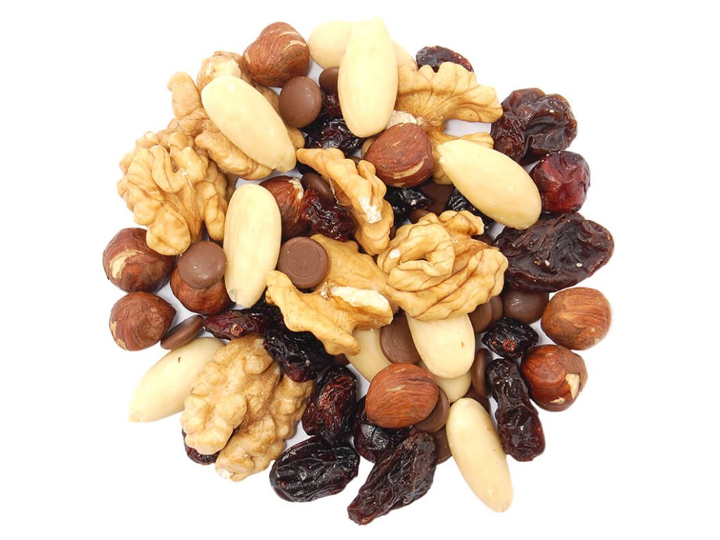 Jádra vlašských ořechů natural, jádra sladkých loupaných mandlí natural, jádra lískových ořechů natural, sušené brusinky (cukr, slunečnicový olej), rozinky Thompson (slunečnicový olej), mléčná čokoláda pecky (18 % kakaové boby, kakaové máslo 24,6%, nerafinovaný třtinový cukr 34%, sušené plnotučné MLÉKO 23%, slunečnicový lecitin max. 0,4%), podíl kakaové sušiny 43%.