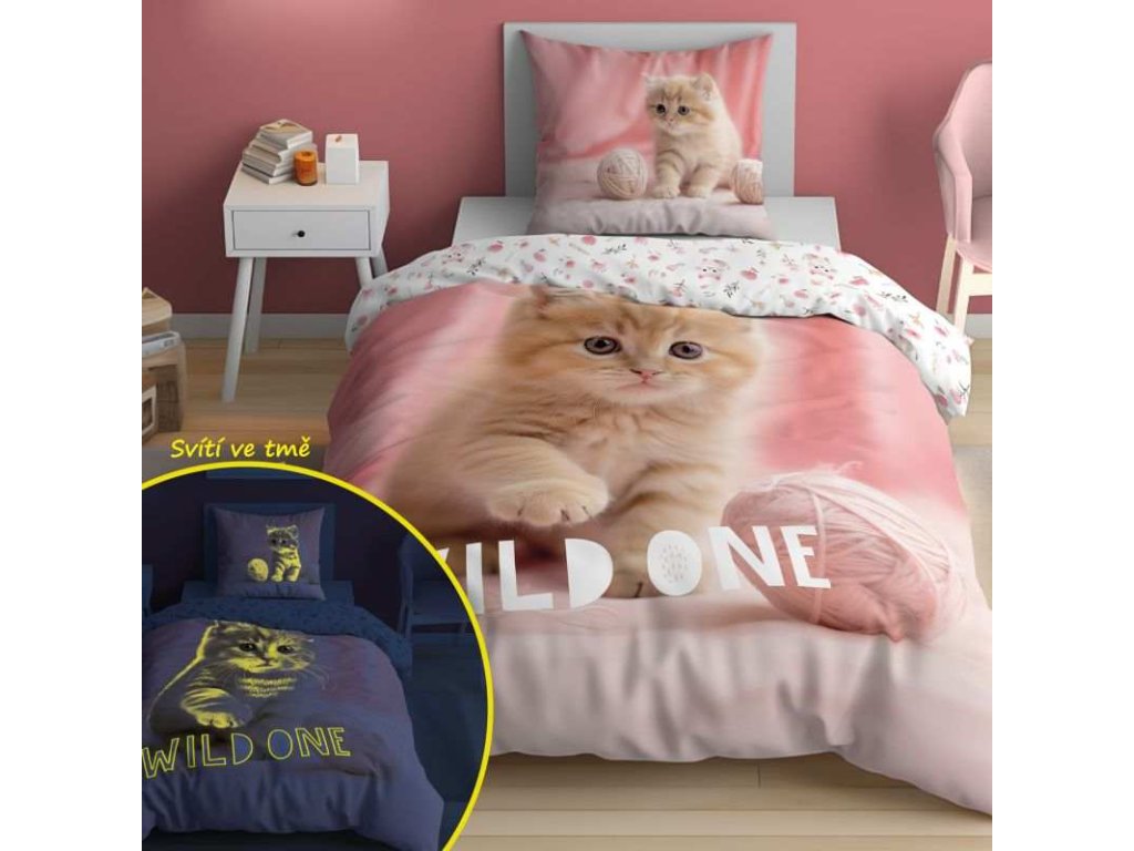 DETEXPOL Povlečení Kotě klubíčko svítící 140/200, 70/80 Bavlněné povlečení na velkou postel, zapínání na zip, povlečení má z každé strany jiný motiv, viz. foto, povlečení svítí ve tmě po nasvícení na denním světle, svítící efekt se může začít vytrácet po 5 vypráních, možno prát na 40°C Materiál: 100% Bavlna Rozměr: 1x 140/200, 1x 70/80 cmDoplňkové parametry