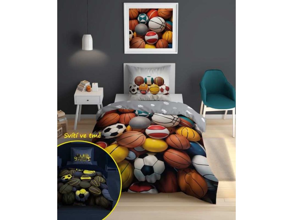 DETEXPOL Povlečení Míče svítící 140/200, 70/80 Bavlněné povlečení na velkou postel, zapínání na zip, povlečení má z každé strany jiný motiv, viz. foto, povlečení svítí ve tmě po nasvícení na denním světle, svítící efekt se může začít vytrácet po 5 vypráních, možno prát na 40°C Materiál: 100% Bavlna Rozměr: 1x 140/200, 1x 70/80 cmDoplňkové parametry