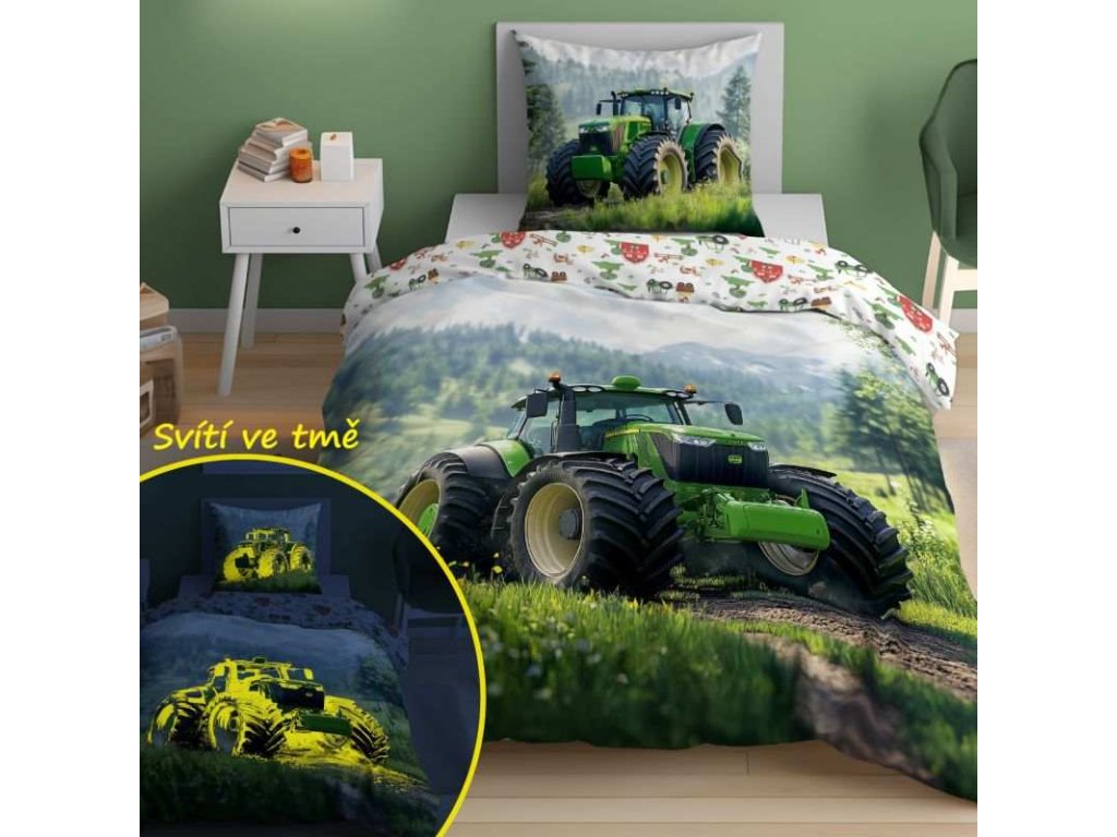 DETEXPOL Povlečení Traktor z hor svítící 140/200, 70/80 Bavlněné povlečení na velkou postel, zapínání na zip, povlečení má z každé strany jiný motiv, viz. foto, povlečení svítí ve tmě po nasvícení na denním světle, svítící efekt se může začít vytrácet po 5 vypráních, možno prát na 40°C Materiál: 100% Bavlna Rozměr: 1x 140/200, 1x 70/80 cmDoplňkové parametry