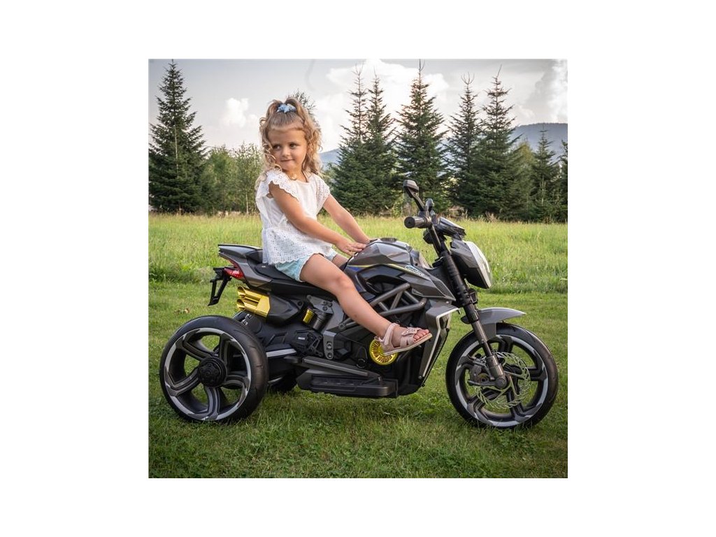 Elektrická motorka Calabre o celkovém výkonu 70W a baterii 12V 7Ah. Motorka je vhodná pro řidiče od 3 let. Délka motorky je 132 cm a díky zlatým detailům a inovativnímu designu bude vaše dítě jistě na cestách nepřehlédnutelné.