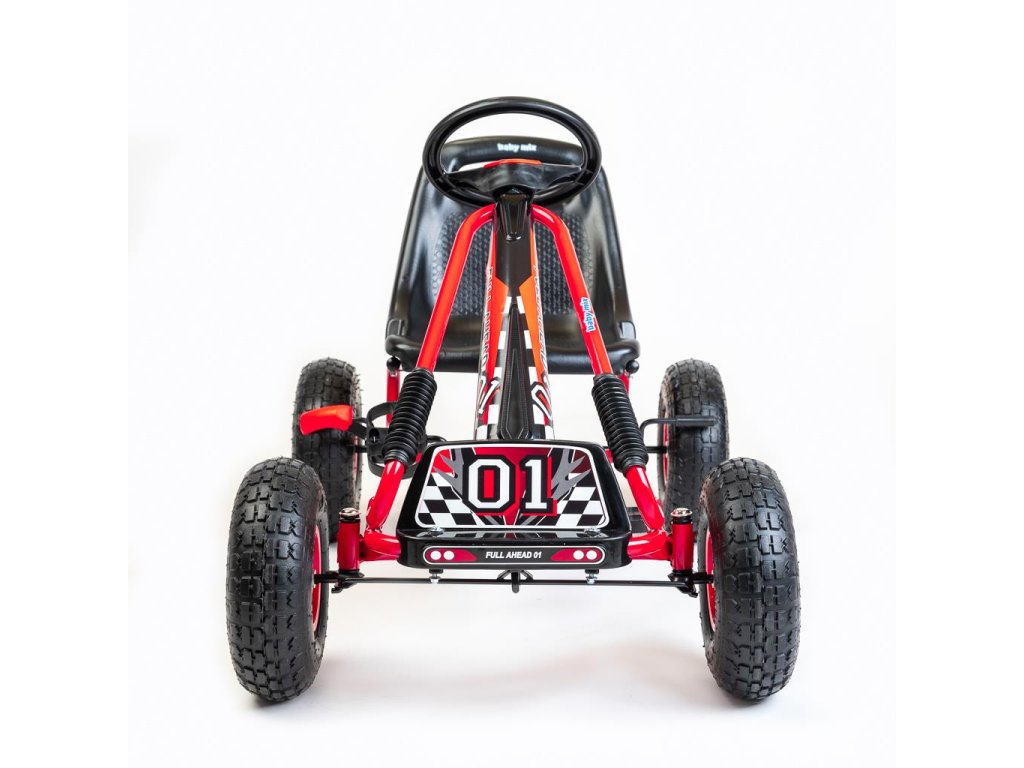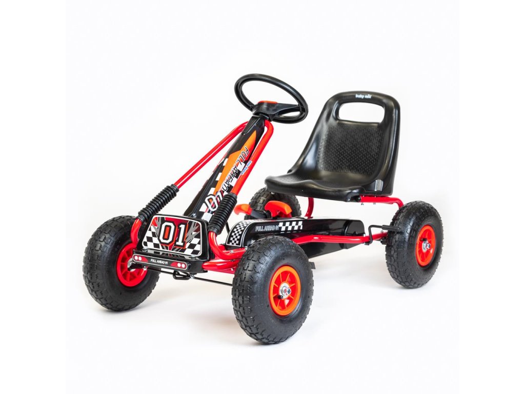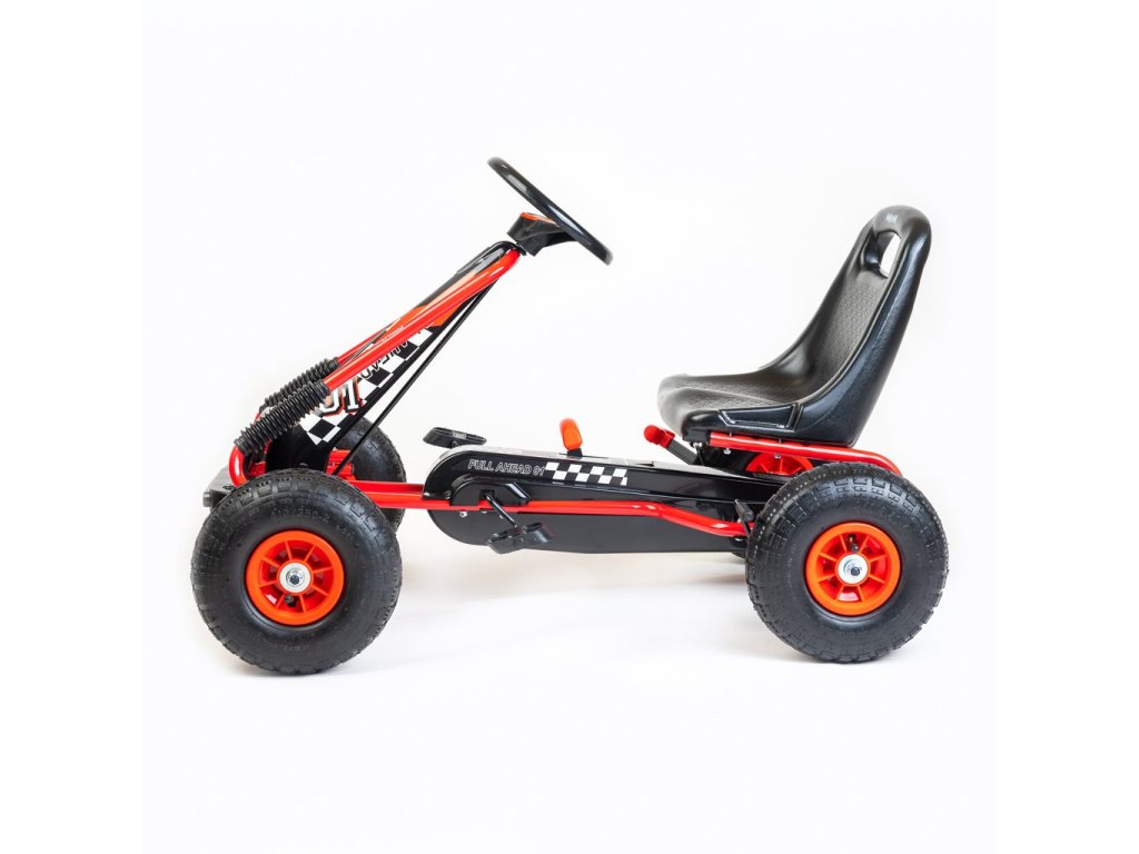 Velké nafukovací pneumatiky zajistí komfort a pohodlí při jízdě na jakémkoli povrchu. Motokára má zabudovaný řetězový pohon s možností odpojení pohonu - funkce volnoběžky a ruční brzdu na zadní nápravě.