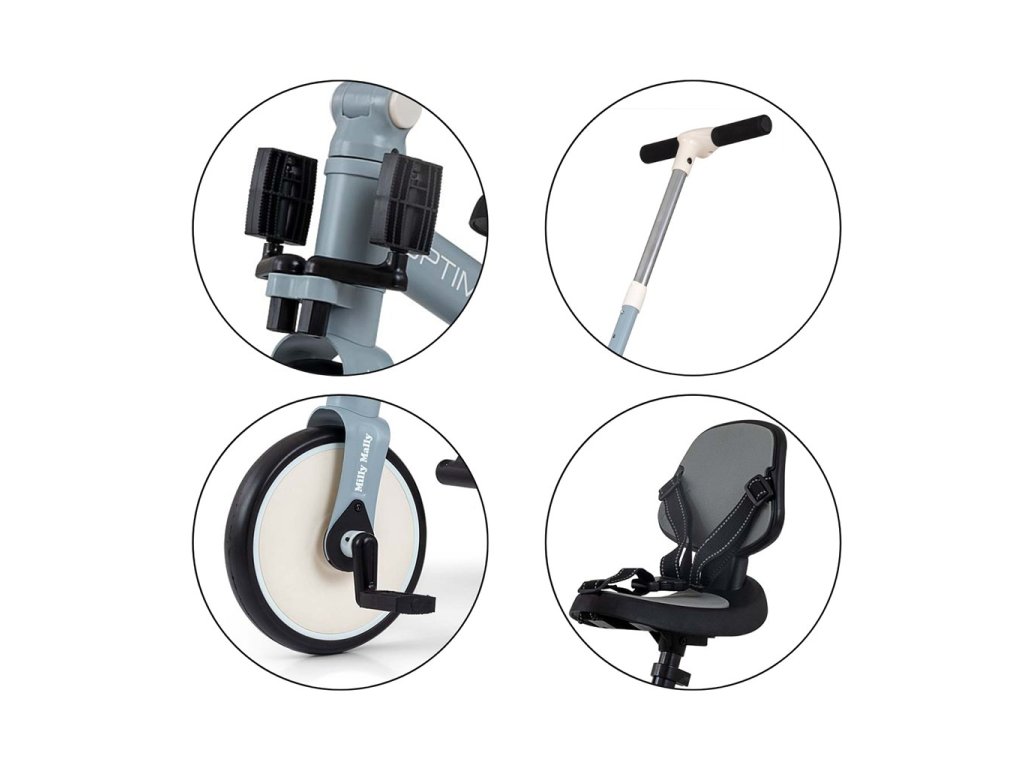 Optimus Max byl navržen tak, aby se stal jednou z nejlepších voleb pro první vozidlo vašeho dítěte. Díky stabilní tříkolové konstrukci poskytuje dítěti odpovídající úroveň bezpečnosti a usnadňuje získávání nových dovedností. Když má dítě již zvládnuté základy jízdy a nevyžaduje pomoc rodiče prostřednictvím řídicí rukojeti, můžeme přidat pedály nebo jej přeměnit na klasické odrážedlo.
