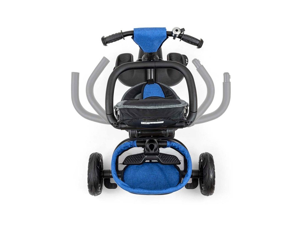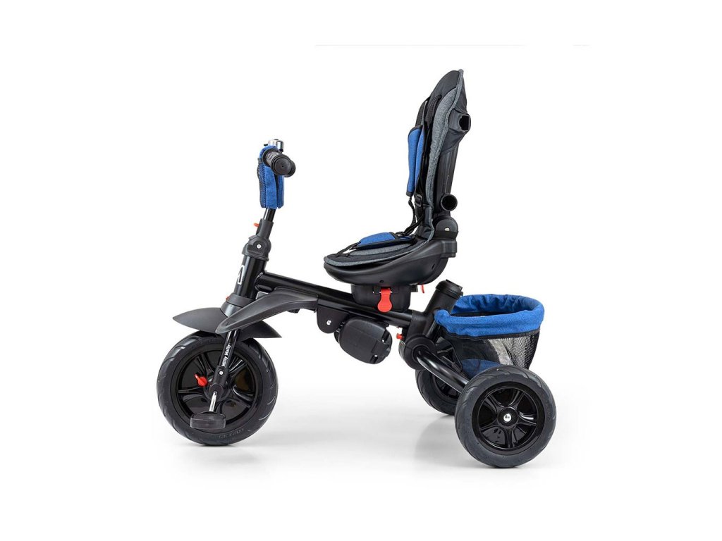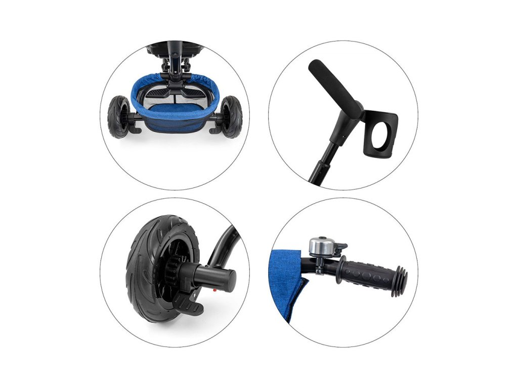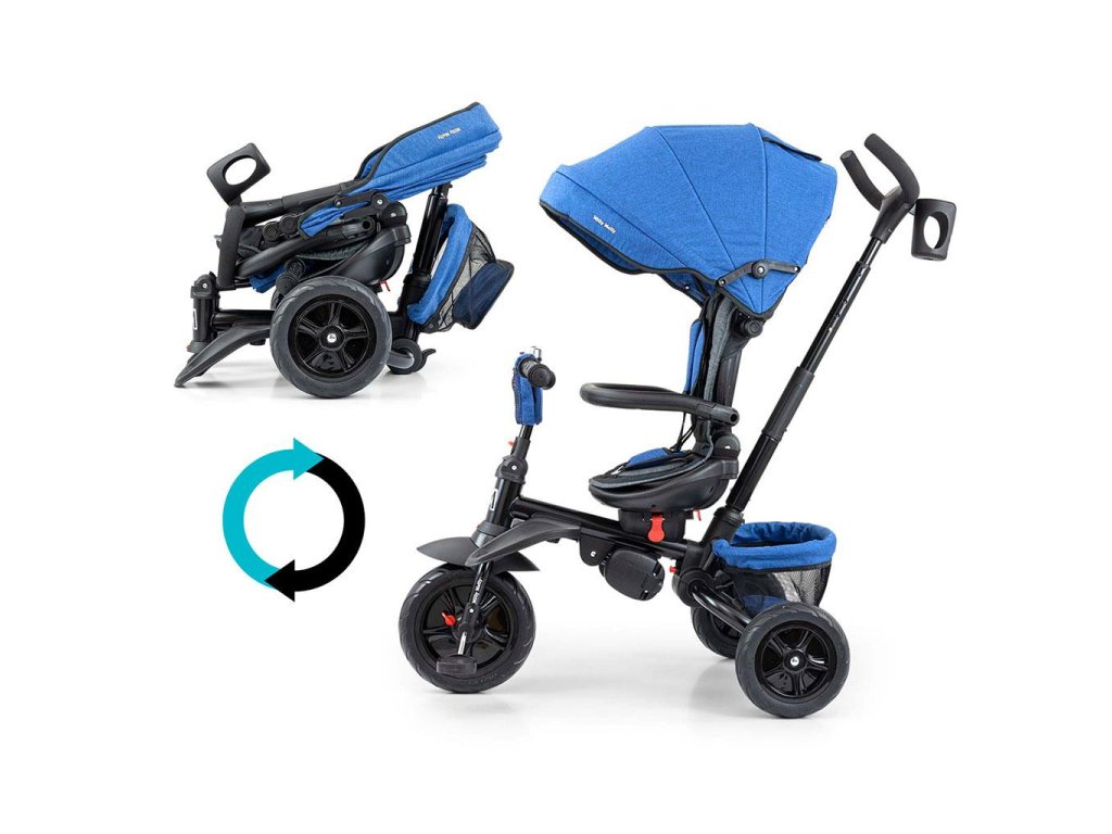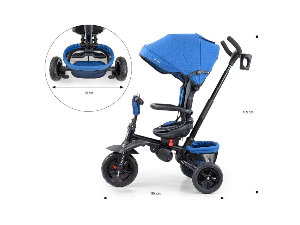 Je vyrobena z kvalitních a odolných materiálů. Má moderní konstrukci, pohodlné a ergonomicky tvarované sedadlo, které je otočné o 360 stupňů, což umožní dítěti cestovat ve směru nebo proti směru jízdy. O pohodlí a bezpečí během jízdy se stará bariérka, tříbodové bezpečnostní pásy, pohodlné stupačky nebo gumová kola, které skvěle absorbují rázy a poskytují dobrou přilnavost. Tříkolku může ovládat jak dítě, tak i rodič pomocí nastavitelné rukojeti pro tlačení. Po odebrání vodící tyče, sklápěcí stříšky, která chrání před sluncem nebo ostatních komponent bude sloužit jako tříkolka. Tříkolku lze používat rovněž jako alternativu golfového kočárku. Pro uložení hraček nebo potřeb pro dítě je zde praktický úložný košík.