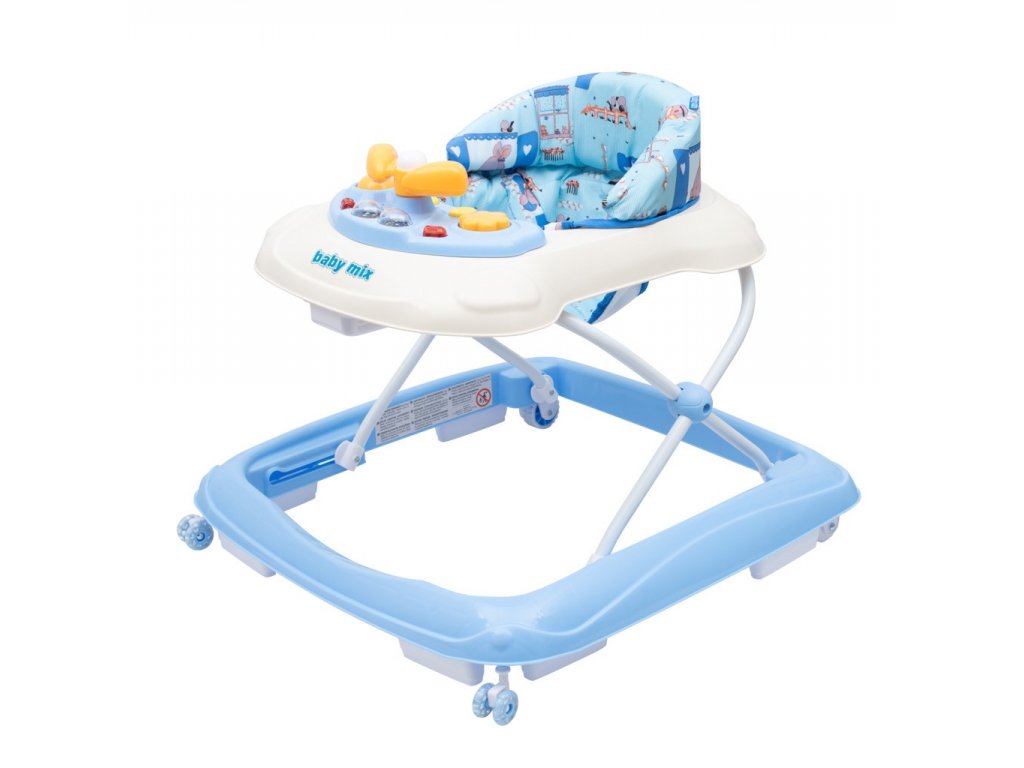 Multimediální chodítko Baby Mix se silikonovými kolečky. Chodítko je vybaveno pohodlným ergonomicky tvarovaným sedadlem, které zajišťuje správné držení páteře. Multimediální panel obsahuje různé světelné efekty, troubící volant, kterým lze otáčet, tlačítka pro přehrávání melodií a dvě světla. Krásné chodítko s hračkami okouzlí malé objevitele a umožní jim hrát si ještě déle. Chodítko je vybaveno speciálním systémem proti převrácení, který zajistí Vašemu dítěti pohodlí a bezpečnost.