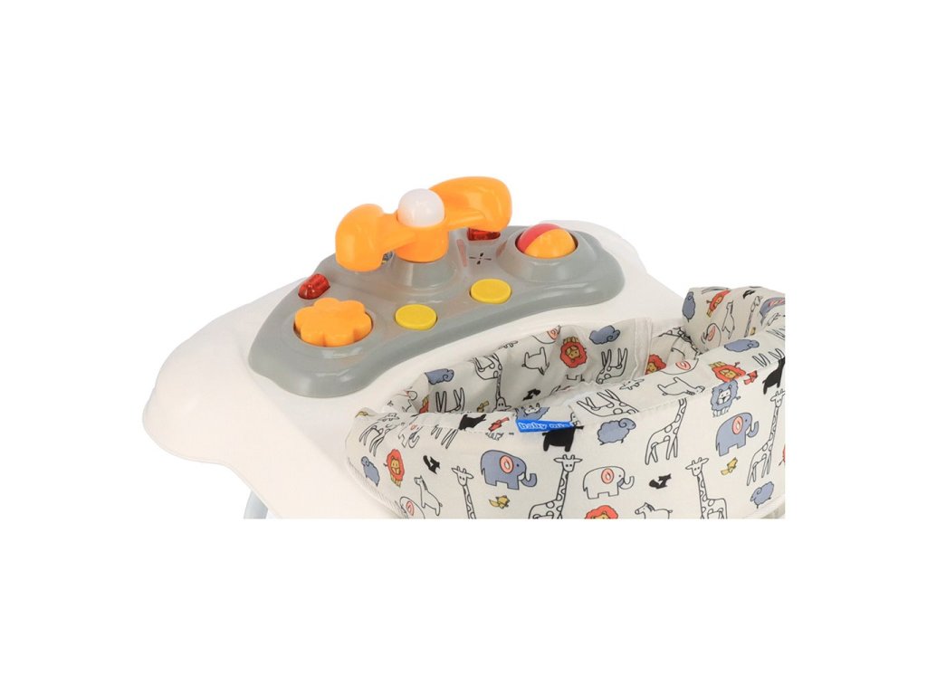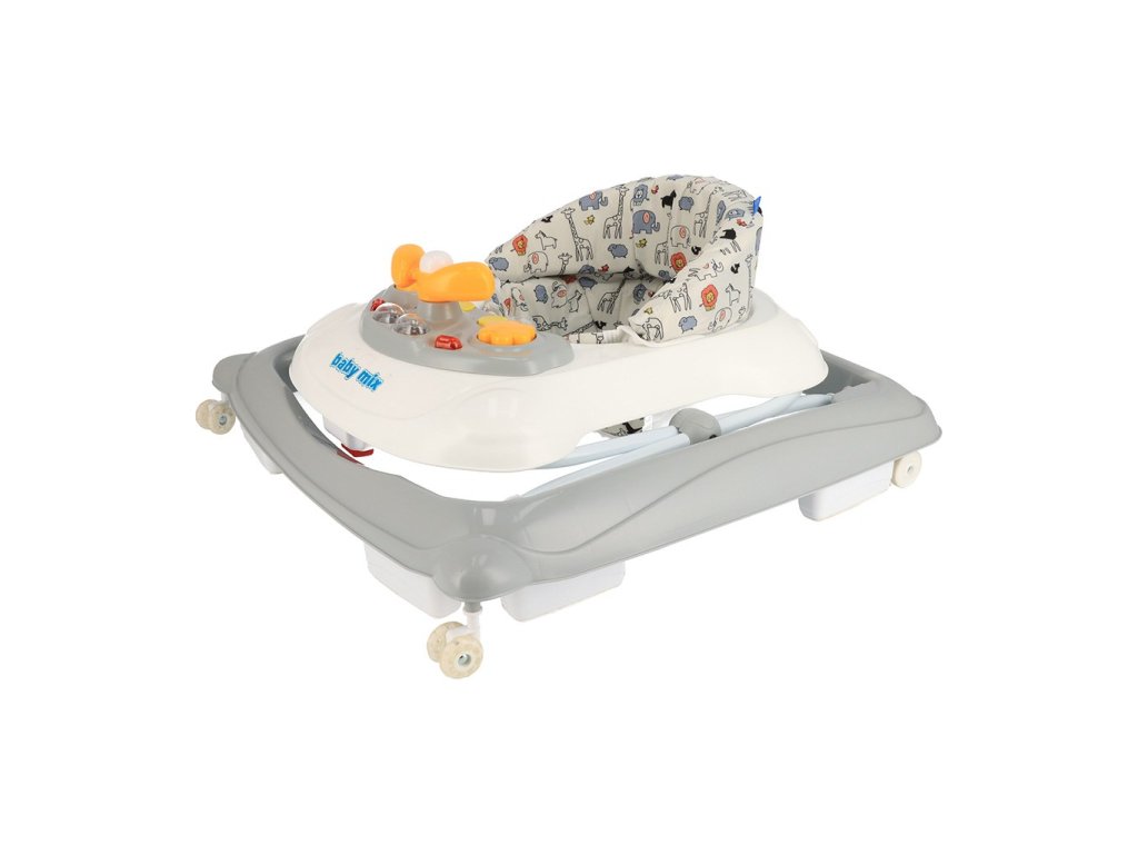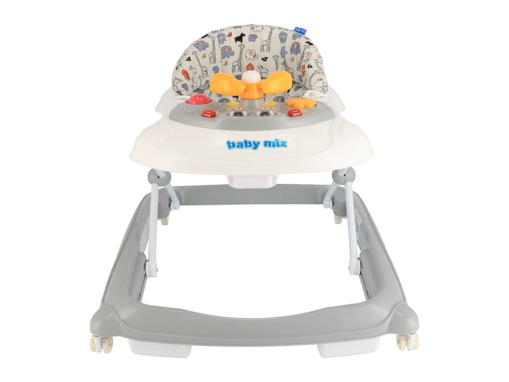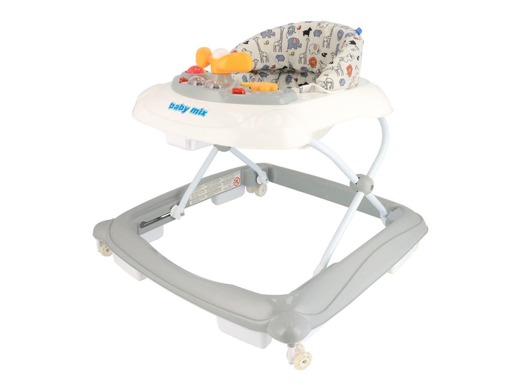 Multimediální chodítko Baby Mix se silikonovými kolečky. Chodítko je vybaveno pohodlným ergonomicky tvarovaným sedadlem, které zajišťuje správné držení páteře. Multimediální panel obsahuje různé světelné efekty, troubící volant, kterým lze otáčet, tlačítka pro přehrávání melodií a dvě světla. Krásné chodítko s hračkami okouzlí malé objevitele a umožní jim hrát si ještě déle. Chodítko je vybaveno speciálním systémem proti převrácení, který zajistí Vašemu dítěti pohodlí a bezpečnost.
