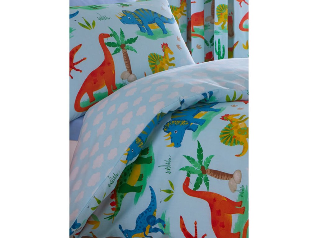 Dětské ložní povlečení s prehistorickými veleještěry dodá dokonalou tečku v ložnici s motivem dinosaurů. Design obsahuje sbírku barevných dinosaurů na světle modrém pozadí. Na povlečení najdete Brontosaura, T-Rexe, Stegosaura a další mezi palmami a rostlinami. Zadní strana povlečení je poseta obrázky mraků.