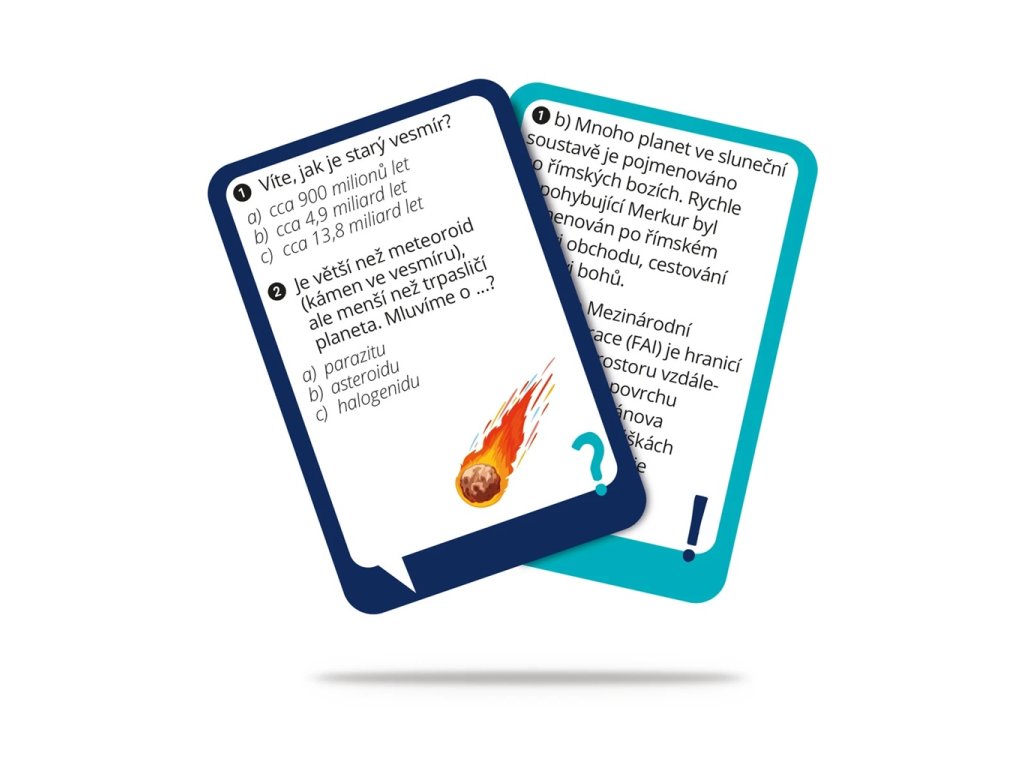 Co se děje při zatmění Měsíce? Který živočich byl jako první vyslán do vesmíru? A víte, kolik měsíců má planeta Jupiter? Zabavte zvídavé děti poutavou vědomostní hrou, při které získají spoustu nových poznatků. Celkem 106 otázek z úžasného světa vesmíru si zvládne přečíst kterékoli dítě od 8 let, ovšem mnohé otázky zaujmou i dospělé hráče. Na každé kartě najdete dvě otázky a na druhé straně odpovědi. Zjistěte, kdo toho ví o vesmíru nejvíce a bude vesmírným odborníkem a zabavte se jak na cestách, tak při přátelském posezení či rodinné oslavě. Hlavní vlastnosti: 53 oboustranných karet s texty v češtině106 otázekzábava pro zvídavé dětispousta zajímavých informací o vesmíruideální na cestydržitel certifikátu Bezpečná a kvalitní hračka Certifikát „Bezpečná a kvalitní hračka“ je vydáván největší zkušební a certifikační organizací v České republice, Technickým a zkušebním ústavem stavebním Praha, s.p. (TZÚS Praha, s.p.), která je členem řady národních i mezinárodních organizací a aktivně se účastní procesu tvorby technických předpisů a norem. Touto značkou se mohou pyšnit produkty splňující přísné podmínky na kvalitu provedení, bezpečnost a vhodnost použití i snadnost údržby. V procesu certifikace se zohledňuje zpětná vazba od prodejců i zákazníků, zejména ale výrobní proces, který musí zaručovat stálou úroveň produkce i organizačních a kontrolních mechanismů. Podmínkou vydání značky „Bezpečná a kvalitní hračka“ je každoroční namátkové podrobení sériového výrobku sérií ověřovacích zkoušek, díky kterému si zákazníci mohou být jisti oprávněností a aktuálností ocenění.Doplňkové parametry
