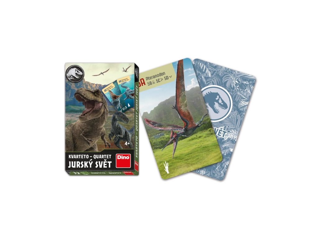 Oblíbená karetní hra s motivem dinosaurů a Jurského světa je určena pro 3–6 hráčů a skládá se z 32 karet, které jsou rozděleny do 8 čtveřic - kvartet Karty v jednotlivých kvartetech tvoří tematické skupiny označené shodnými symboly. Vyhrává ten, kdo získá nejvíce čtveřic se shodnými symboly. Děti se díky hře zdokonalí v komunikaci, rozvíjejí kombinační schopnosti a logické myšlení. A navíc se dozvědí zajímavé informace o vzhledu, váze a rozměrech jednotlivých dinosaurů. Balení obsahuje: 32 karet v papírové krabičce1 návod Hlavní vlastnosti: rozvíjí kombinační a komunikační dovednosti a logické myšlenívyrobeno v ČRDoplňkové parametry