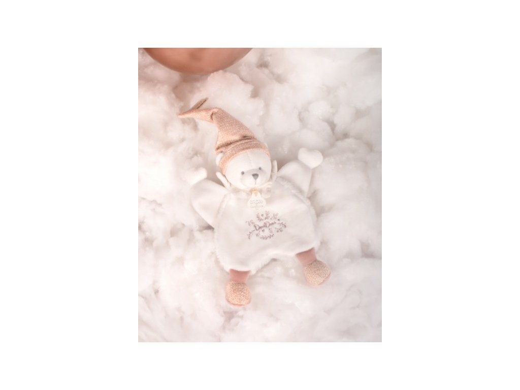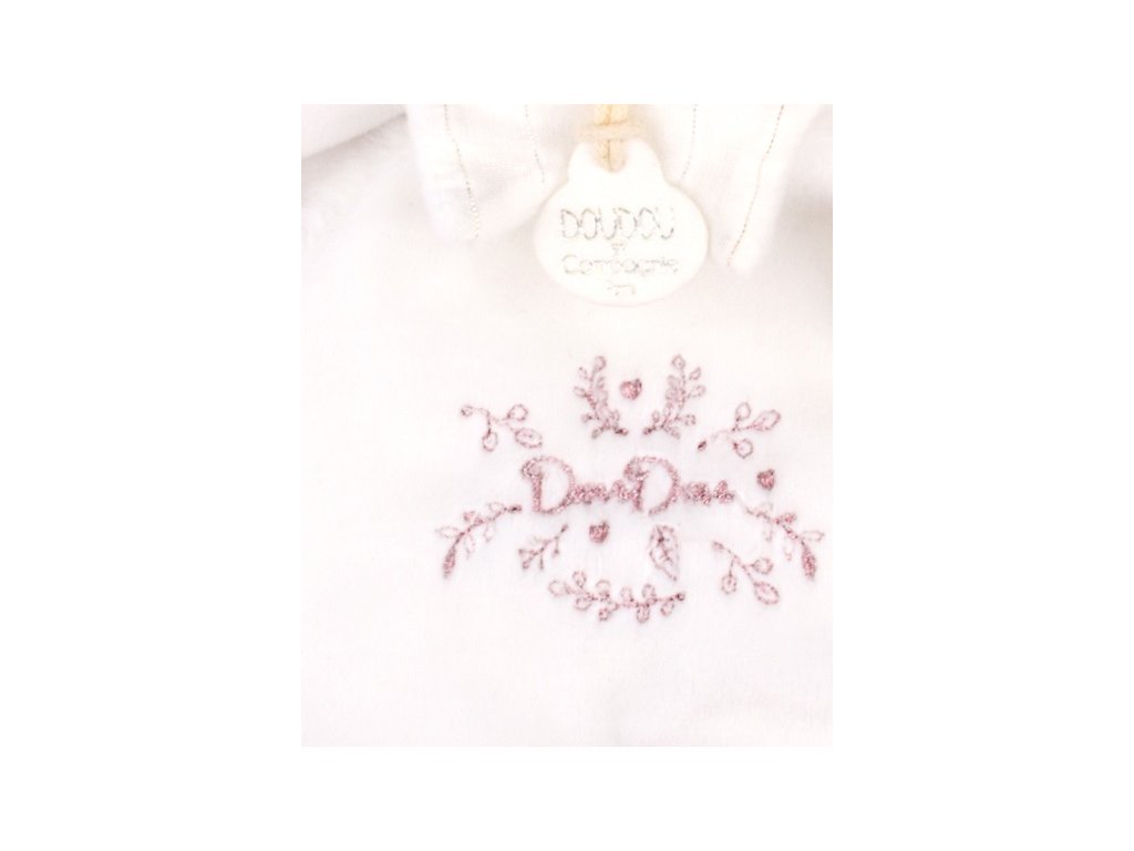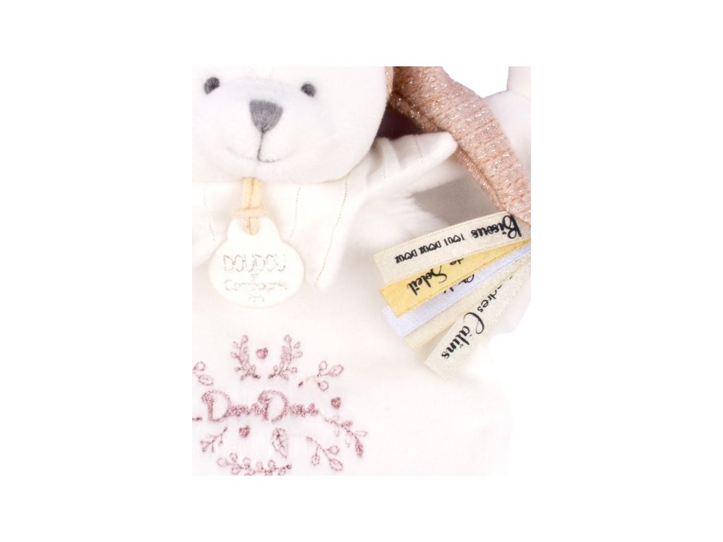 Plyšový muchláček medvídek je ideálním dárkem pro děti již od narození. Medvídek má na hlavě roztomilou růžovou čepičku a měkké růžové tlapky, které vypadají, jako by měl na nožkách malinké bačkůrky. Pod krkem má bílý límeček a na bříšku najdete jemnou růžovou výšivku značky Doudou, která podtrhuje jeho něžný vzhled.