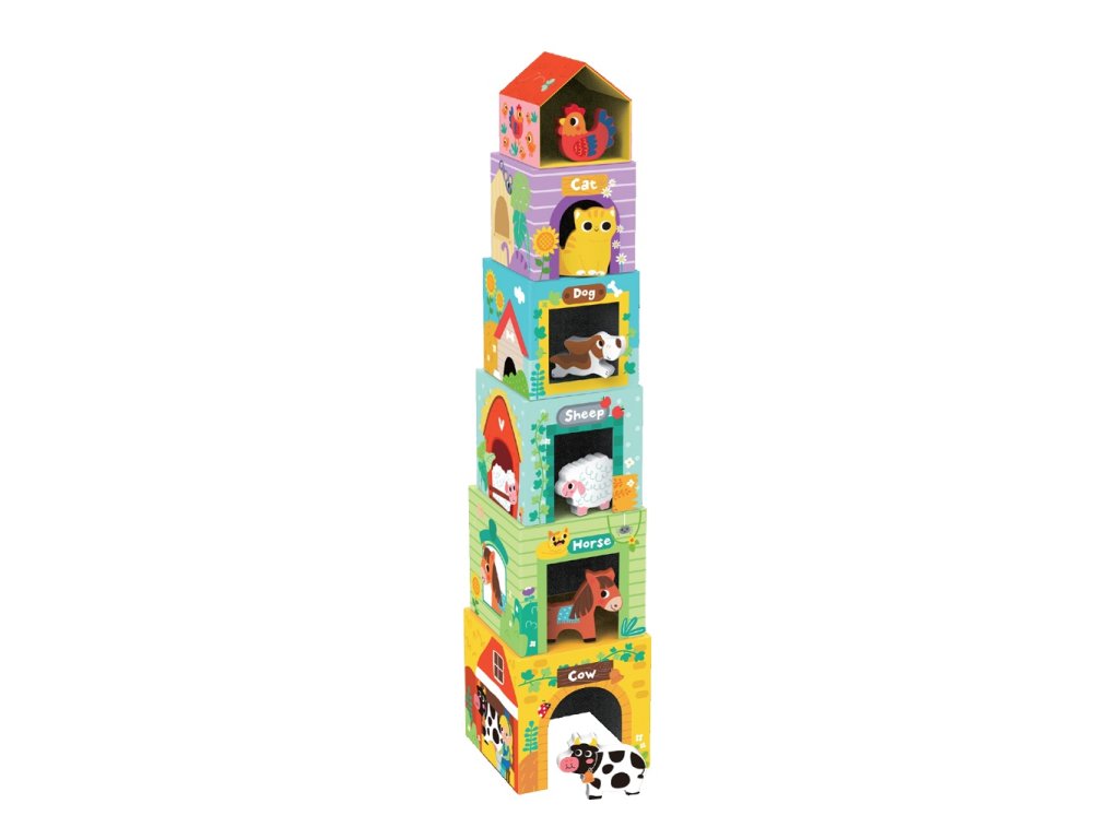 Těchto šest kostek s okýnkem slouží nejenom jako skládací věž, ale i jako domečky pro příslušná zvířátka - každý kamarád z farmy má tedy své bezpečné místečko. Aby děti věděli, jak správně na sebe domečky pokládat, každý je opatřen svým jedinečným číslem. Skládání a třídění pomáhá rozvinout porozumění barvám a tvarům a procvičuje motoriku s koordinací. Sada podněcuje k nápadité hře. Dává dětem možnost se naučit jak hospodářská zvířátka žijí a jak se o ně správně postarat. Hlavní vlastnosti: kompaktní, skladné provedenírozvíjí motoriku a představivosttvoří vztah k zvířatům a přírodě Značka a certifikát FSC® (Forest Stewardship Council) zaručuje, že dřevo, ze kterého byl produkt vyroben, nebylo vytěženo nelegálně a pochází z lesů obhospodařovaných šetrným či přírodě blízkým způsobem, ve kterém jsou dodržovány přísné environmentální a sociální požadavky. Značka FSC® na výrobku znamená, že svým nákupem pomáháte chránit lesy a podporujete šetrné, odpovědné či přírodě blízké hospodaření, díky kterému jsou naše lesy stabilnější, zdravější, mají přirozenou druhovou skladbu a lépe odolávají negativním následkům klimatických změn.Doplňkové parametry