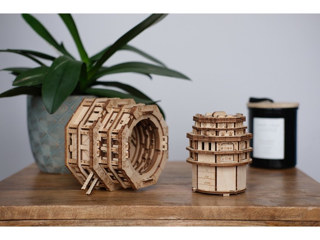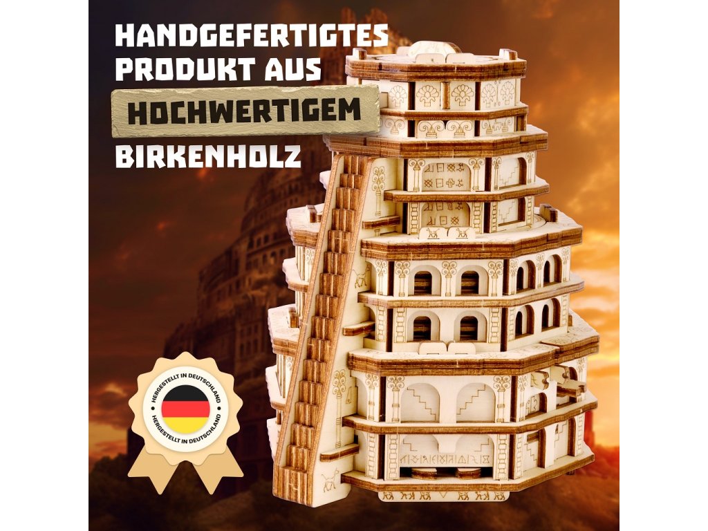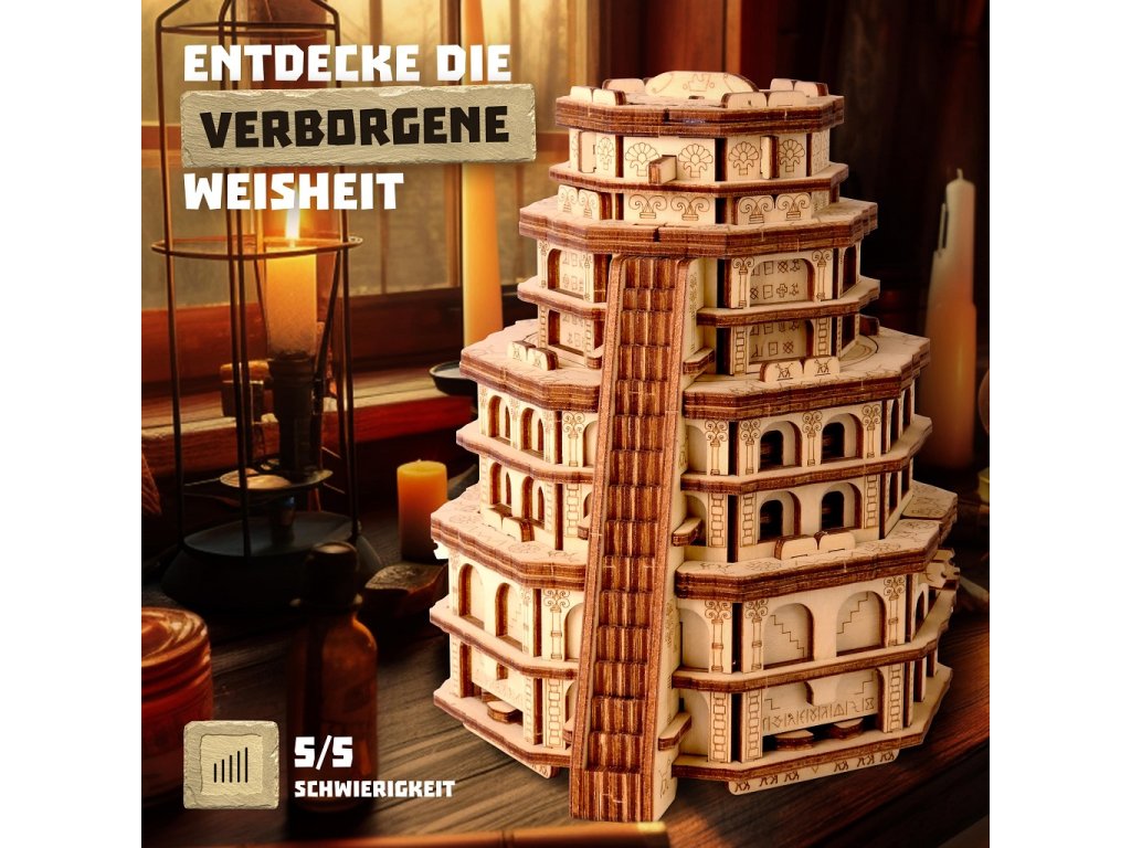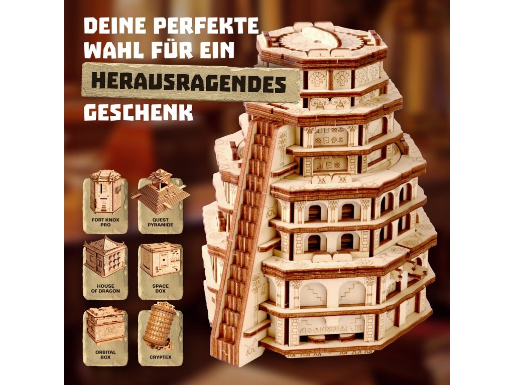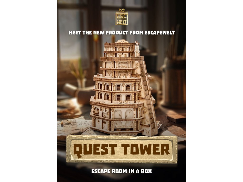 Ve starobylém městě Babylon stála kolosální věž, která se tyčila vysoko k obloze. Říkalo se, že tato mystická věž byla výtvorem samotných bohů. Lidé věřili, že hluboko uvnitř věže, za řadou hádanek, byl ukryt tajemný artefakt, který dával nezměrnou moudrost a sílu. Odvážíš se objevit četná tajemství Quest Tower, abys otestoval svou mysl a inteligenci? Tato kolosální výzva, krásně navržená a pečlivě vytvořená, slibuje, že uchvátí vaši mysl a zažehne jiskřičku Vaší zvědavosti. Quest Tower je vyroben výhradně z březového dřeva a je ekologicky šetrným výrobkem. ∗★∗Zakuste atmosféru únikových her s originálními scénáři a hádankami u Vás doma! Každý hlavolam ukrývá malou přihrádku, kterou můžete kreativně využít k úschově vodítka ve vlastní dobrodružné hře, nebo zpestření zážitku z drobného dárku. Součástí každého balení je jednoduchý obrázkový návod, který obsahuje také QR kód vedoucí na stránku s nápovědou. Rébus má vždy jedno řešení, kvalitním provedením je ale předurčen k dalšímu použití, neváhejte jím proto dále obdarovat a vyzvat své přátele, nebo členy rodiny. Hlavní vlastnosti: rozměry vnitřní přihrádky 6x3,7x3,7 cmvysoká obtížnost řešenívyrobeno v EUDoplňkové parametry