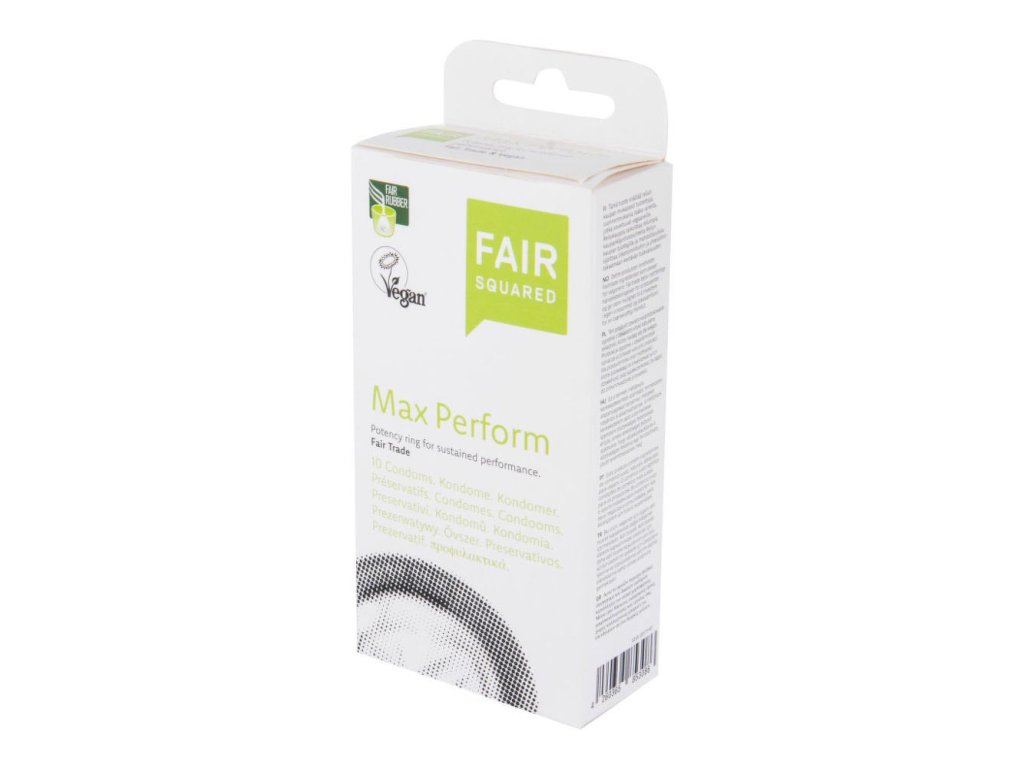 Kondomy Fair Squared jsou pohodlnou a účinnou bariérovou ochranou před nechtěným těhotenstvím a pohlavními chorobami. Vyrobené jsou z extra tenkého průhledného materiálu, na jehož přípravu byl použit přírodní latex vypěstovaný v Indii, v souladu s Fair Trade principy. Kondomy jsou bez příchutě a parfemace, s lubrikantem bez spermicidních složek. Každý kondom Max Perform je vybaven penisovým kroužkem pro těsnější přilnutí, který zabraňuje náhodnému sklouznutí kondomu a zároveň působí jako podpora erekce. Na rozdíl od konvenčních kondomů neobsahují mléčný protein kasein, a jsou proto vhodné i pro vegany.Doplňkové parametry
