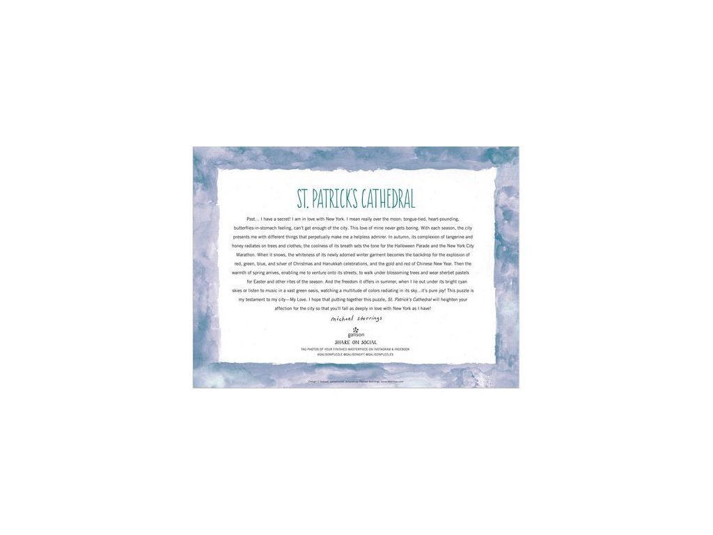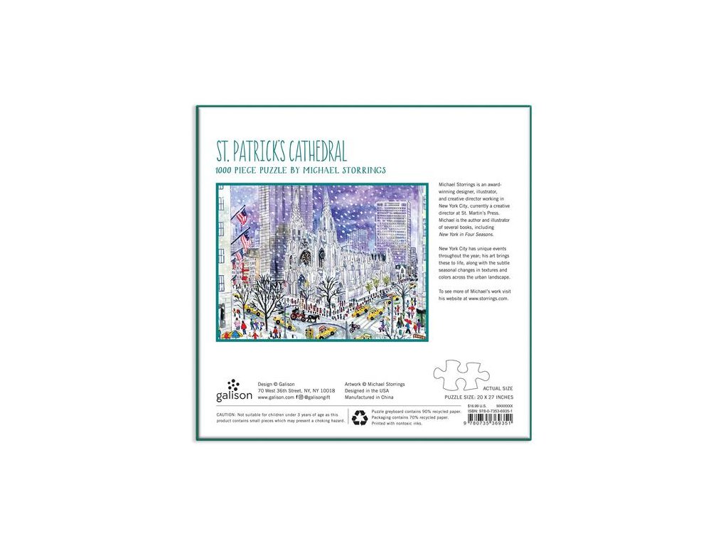 Oceňovaný designér, ilustrátor a kreativní ředitel Michael Storrings zachycuje ikonický katolický kostel a dominantu New Yorku, katedrálu sv. Patrika. Puzzle jsou baleny v pevných krabicích s matným povrchem. Součástí je také příloha s celým obrázkem puzzle. Hlavní vlastnosti: Obsahuje 1000 dílků Prémiová kvalita puzzle Jednotlivé dílky do sebe přesně pasují Rozvíjí logické myšlení a motorikuDoplňkové parametry