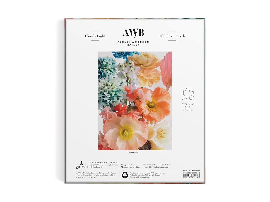 Puzzle Květy Floridy obsahuje úžasnou fotografii pastelově zbarvených květin v barvách modré, zelené, tyrkysové, broskvové, růžové a žluté. Puzzle je baleno v pevné krabici, pro opětovné použití a skladování. Ideální jako dárek. Autorem obrázku je Autorem obrázku je Ashley Woodson Bailey. Puzzle jsou vyrobeny za použití významného podílu recyklovaného papíru a nabízí špičkový potisk nezávadnými barvami. Jsou opatřeny matnou povrchovou úpravou, která zajišťuje za všech okolností věrné podání detailů i barev. Jejich zadní strana je potažena hladkým, na dotek příjemným povrchem, díky němuž se při skladování rozloženého puzzle netvoří prach. Spolu s pečlivě zabalenými dílky naleznete v balení také letáček s návodným obrázkem, který zpravidla obsahuje další informace o tvůrcích a pozadí vzniku díla. Dodáváno v mimořádně pevné a poutavě zpracované kartonové krabičce vyrobené z recyklovaného kartonu a udržitelně získaných materiálů s certifikací FSC®. Hlavní vlastnosti: 1000 precizně vyřezaných dílkůvyrobeno s použitím recyklovaných a udržitelně získaných materiálůpečlivě vybraný motiv od renomovaných tvůrců a umělcůpotisk a provedení nejvyšší kvalityobsahuje návodný obrázekDoplňkové parametry