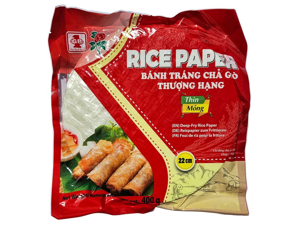 Tento rýžový papír je vhodný zvlášť na přípravu smažených závitků. Před použitím krátce ponořte sušené plátky z rýžového těsta do vlažné vody a nechte změknout po dobu asi 1-2 minut na kuchyňské utěrce. Když jsou plátky dostatečně měkké, zabalte do nich zeleninu, nudle nebo maso a usmažte.