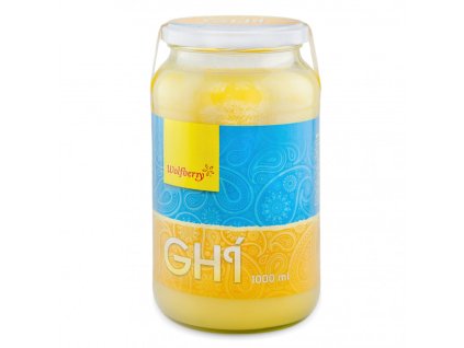 Ghí 1000 ml Wolfberry. Ghí je máselný tuk vyrobený podle starodávného ajurvédského receptu přepuštěním 100% másla.