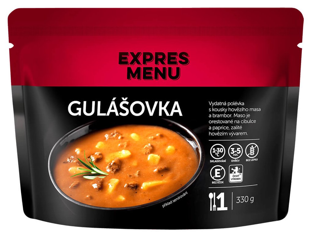 Vydatná svačinová polévka s kousky hovězího masa a brambor. Maso je orestované na cibulce a paprice, zalité hovězím vývarem. Polévka je dochucená majoránkou a česnekem. Z jednoho balení připravíte 1 porci. Trvanlivost až 10 let.