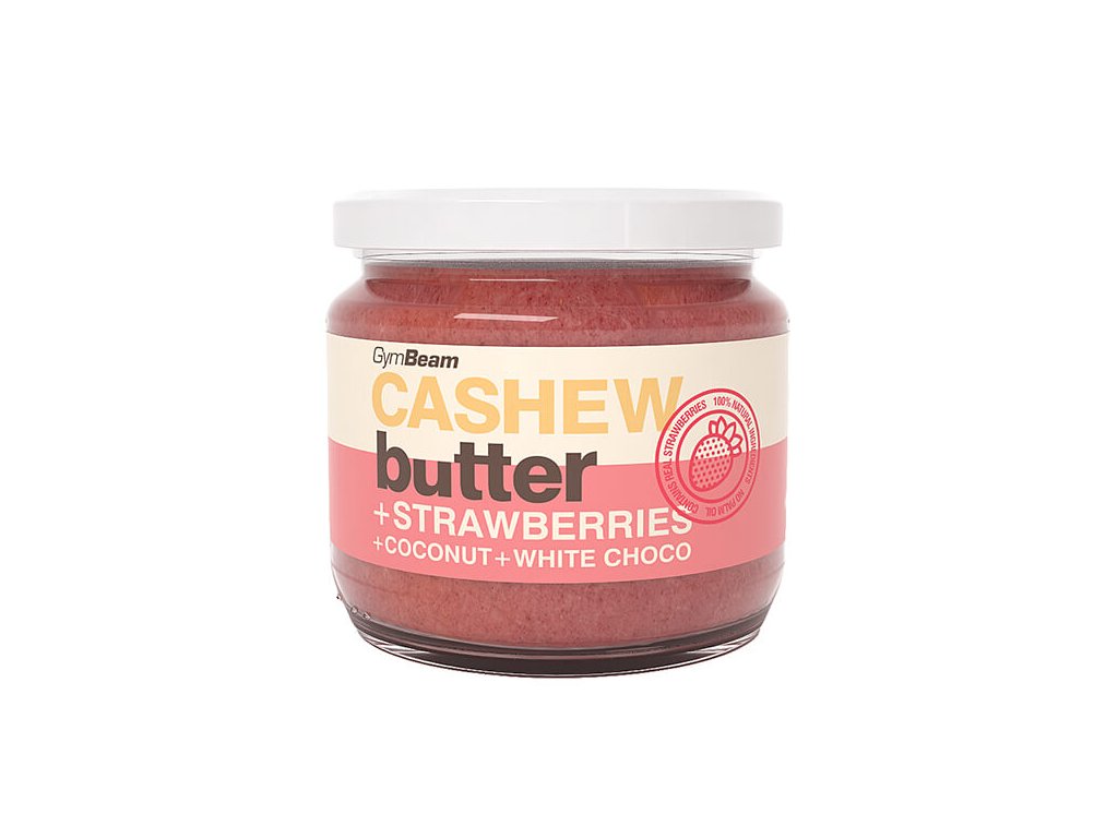 GymBeam Kešu máslo s kokosem, bílou čokoládou a jahodami 340 g