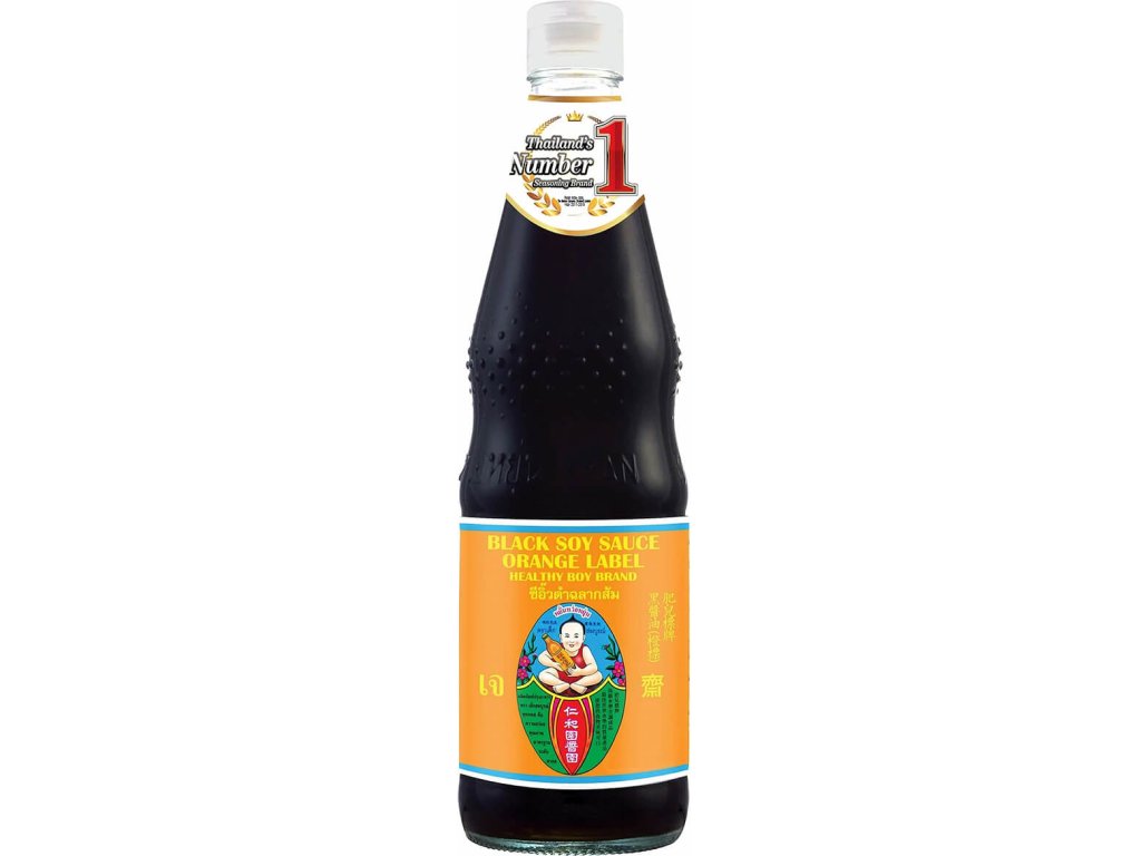 Healthy Boy Black Soy Sauce ORANGE LABEL je sójová omáčka, která patří k základním dochucovadlům thajské kuchyně. Na rozdíl od běžných tmavých sójových omáček je jemnější, méně slaná a má lehce nasládlou chuť.