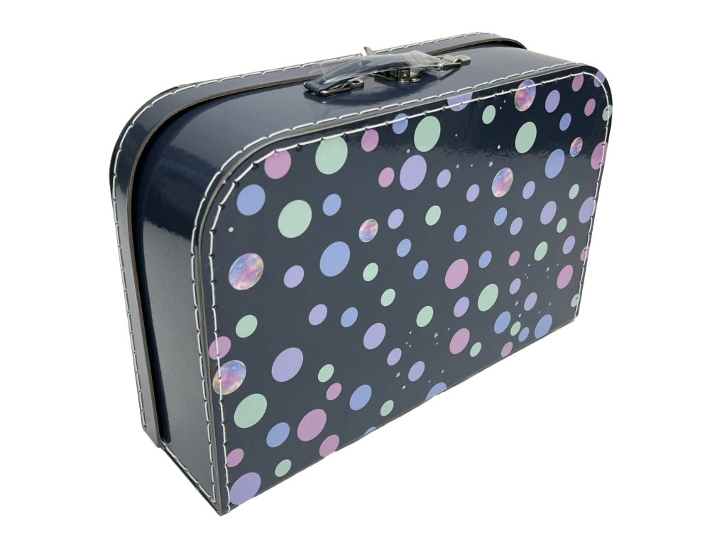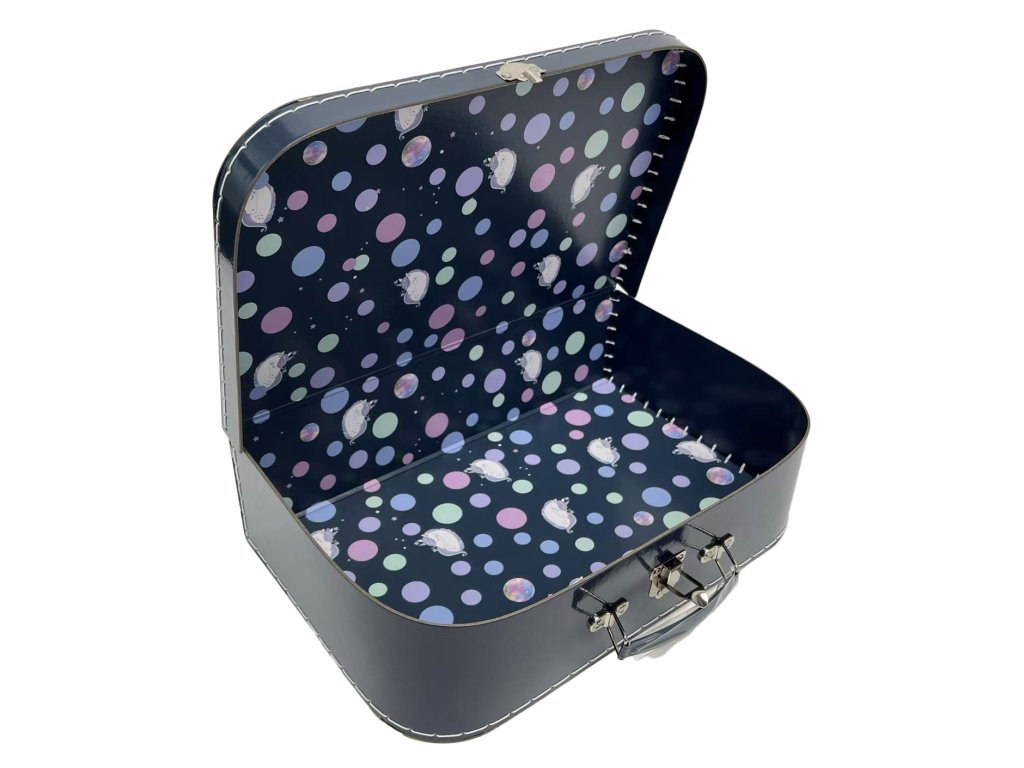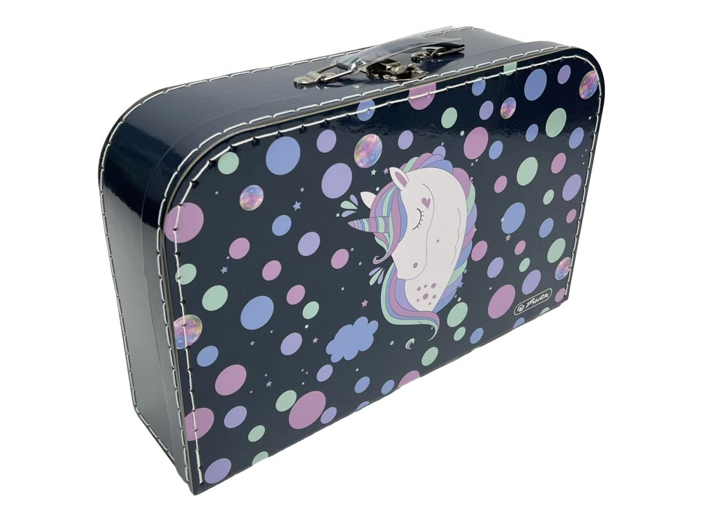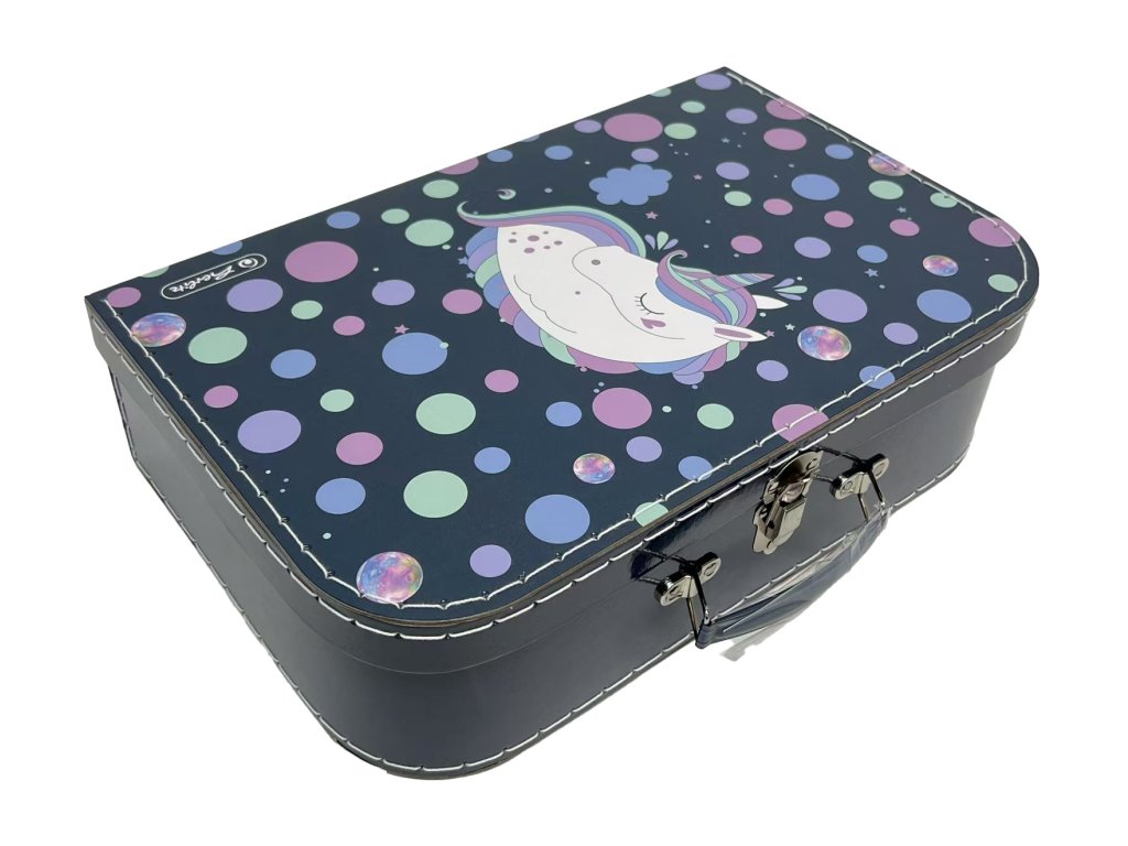 Kufřík 35 cm - motiv Unicorn Dětský kufřík je vyrobený z kartonové lepenky a potažený potištěným papírem. Uzavírá se kovovou sponkou. Součástí kufříku je i praktické ucho na snadné přenášení. Kufřík je vhodný nejen do školy na výtvarné potřeby, ale i pro uchování hraček a malých dětských pokladů. Rozměry kufříku jsou cca 35,5 x 23 x 10 cm.