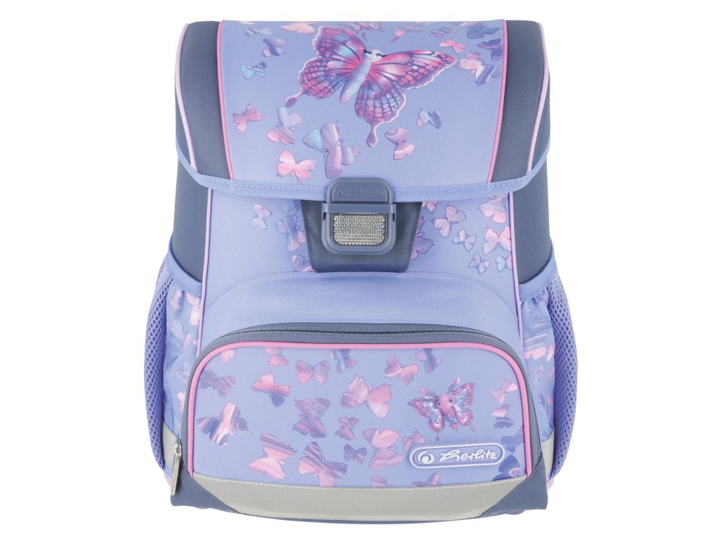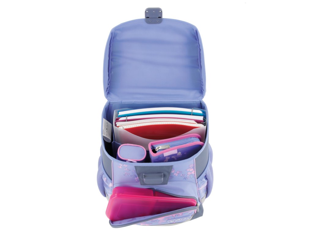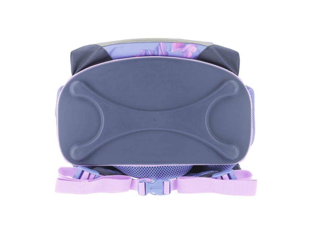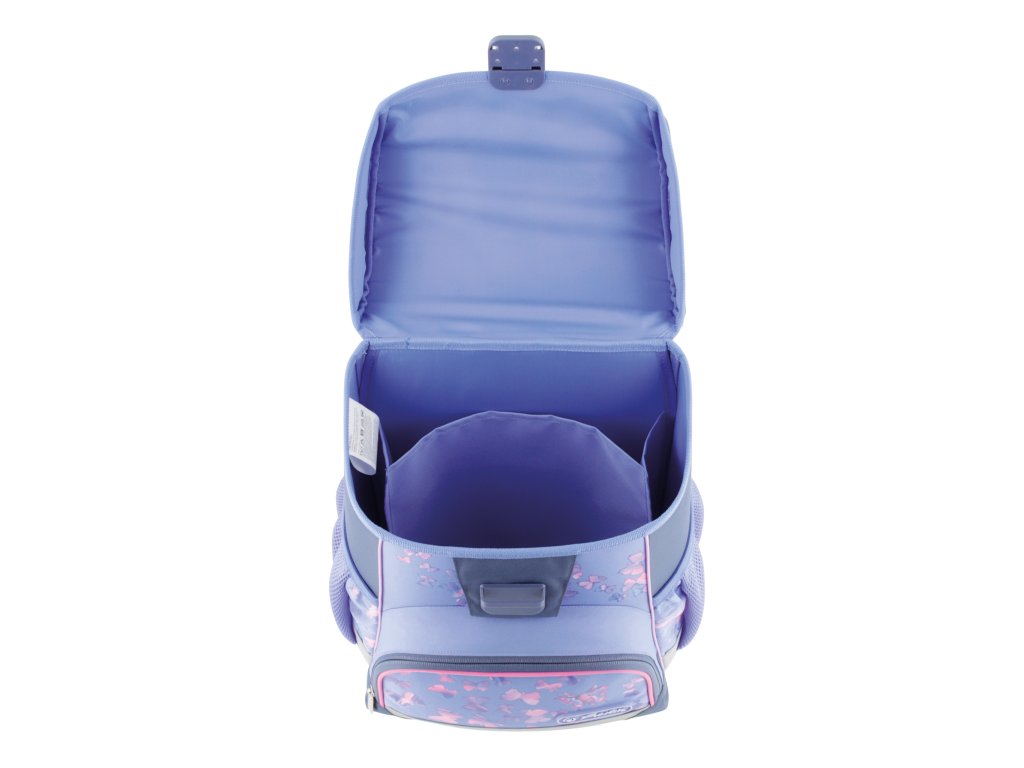 37 x 31 x 22 cm, ergonomicky tvarované a prodyšné polstrování zad, nastavitelné ramenní popruhy, výškově nastavitelný hrudní pás, hlavní kapsa s prostorem pro knihy, boční kapsy s elastickými pásky, přední kapsa na zip, stabilní spodní deska s nožičkami, pohodlná rukojeť, zavírání Click lock s odrazkou, reflexní materiály Oralite. Hmotnost 950 g, objem 16 l, voděodolná, bez PVC, výbava: penál, sáček na cvičky, kulaté pouzdro, certifikát ergonomie 2023 a 2025