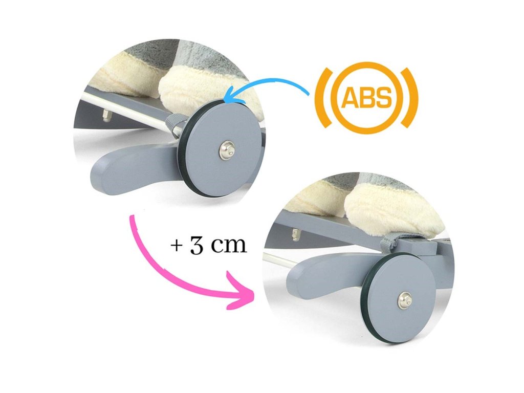 Měkoučký houpací koník Polly byl navržen pro nejmladší děti, pro které jsou tradiční houpací koně příliš velké. Pohodlné a tvarované sedadlo ve tvaru křesla a nastavitelné popruhy poskytují pohodlí a bezpečnost během bezstarostného houpání vašeho dítěte. Opěrky pro nohy na lištách a rukojeti ještě více pomáhají udržet rovnováhu. Překlopením jednoduchého mechanismu na lištách vysunete kolečka, čímž ve vteřině změníte houpací hračku v jezdícího koníka. Houpací lišty lze jednoduše odšroubovat. Po stisknutí ouška koník vesele zařechtá, po stisknutí druhého vydá zvuk klusajícího koně. Baterie se vkládají do poudra umístěného na bříšku.