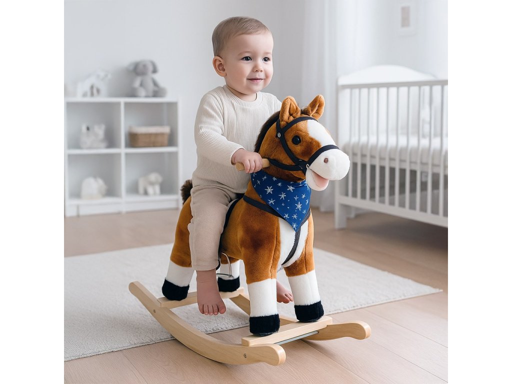 Neobyčejně krásný houpací koník s červeným šátkem na krku. Po zmáčknutí oušek koník zavrtí ocáskem, otevírá ústa, vydává zvuky klusajícího koně nebo zpívá písničku. Pohodlné sedlo, pevná uzda, dřevěné rukojeti nebo kovové třmeny zajistí vašim kovbojům ještě větší stabilitu a komfort během houpání. Je vyroben z měkkého plyšového materiálu, pevné dřevěné lišty nebo rukojeti lze snadno odšroubovat. Baterie se vkládají do pouzdra umístěného na bříšku koníka.