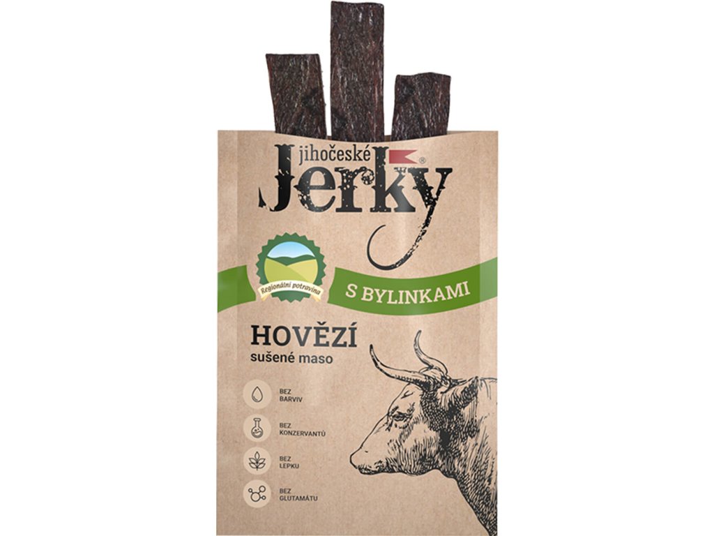 Jihočeské Jerky Hovězí s bylinkami je sušené maso, které spojuje poctivou chuť hovězího s jemně aromatickým dotekem vybraných bylinek. Základem je kvalitní hovězí maso sušené tradiční metodou, díky níž si zachovává svou přirozenou šťavnatost a strukturu.